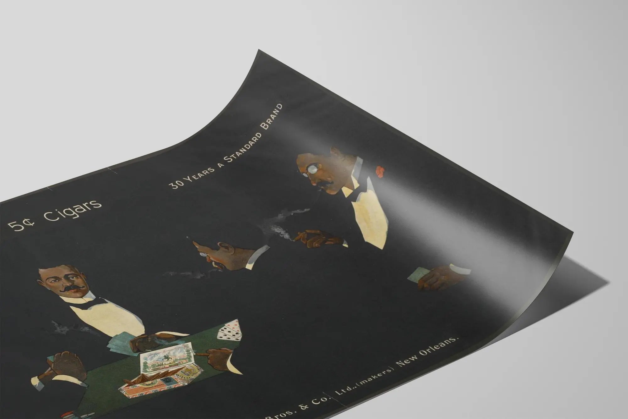 Idealny jako plakat lub oprawiona reprodukcja, ta dekoracja ścienna dodaje przestrzeni narracyjnego wymiaru, niezależnie od tego, czy jest to salon, biuro czy domowy bar. Głęboka czarna tło podkreśla postacie i kluczowe elementy sceny, wzmacniając wizualną intensywność obrazu. Subtelny i elegancki tekst "Jackson Square 5¢ Cigars" oraz napis "30 Years a Standard Brand" dodają autentyczności reklamowej tej pracy, oddając hołd klasycznej marce cygar.