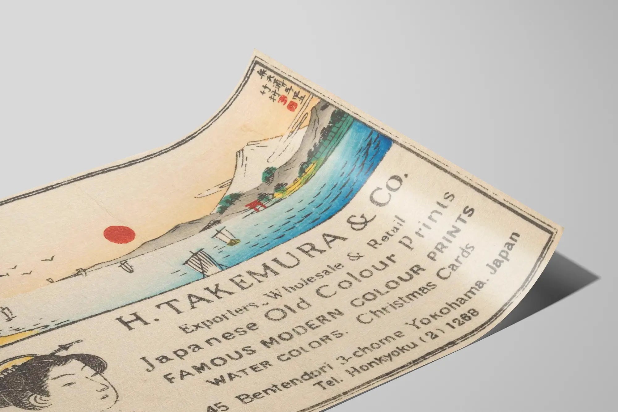 Ta plakat vintage przedstawia tradycyjną japońską wizytówkę domu H. Takemura & Co., specjalizującego się w eksporcie i hurtowej sprzedaży starych japońskich odbitek kolorowych. Idealna jako dekoracja ścienna, ta reprodukcja oddaje elegancję klasycznego stylu japońskiego z autentycznymi elementami graficznymi, w tym postacią kobiety w kimono i pejzażem morskim w tle, ukazując piękno japońskiej natury. Dekorację uzupełnia czerwone słońce zachodzące za górą oraz ikoniczna góra, dodając poetyckiego charakteru tej plakacie, która nawiązuje do nowoczesnych odbitek kolorowych, akwareli oraz kart świątecznych. Doskonała dla miłośników japońskiej sztuki i tradycyjnej inspiracji w dekoracji ściennej, ta plakat zachęca do odkrywania bogactwa starych japońskich druków kolorowych w stonowanym i wyrafinowanym stylu. Projekt zawiera także starożytną typografię wkomponowaną w kompozycję, podkreślając adres Yokohama, co wzmacnia historyczny i kulturowy charakter tego elementu dekoracyjnego. Ten plakat to idealny wybór do ozdobienia wnętrza unikalnym, artystycznym akcentem, łączącym tradycję z estetyką w eleganckiej dekoracji ściennej.