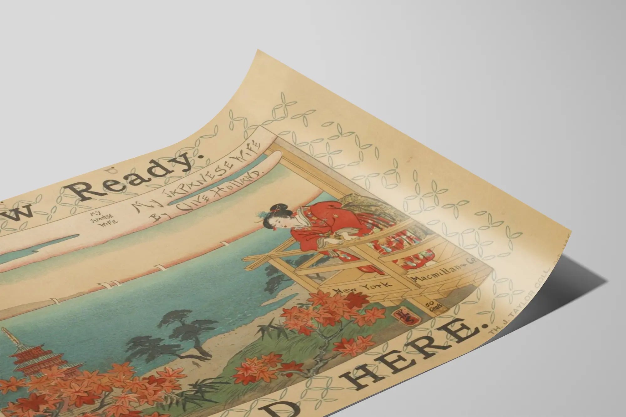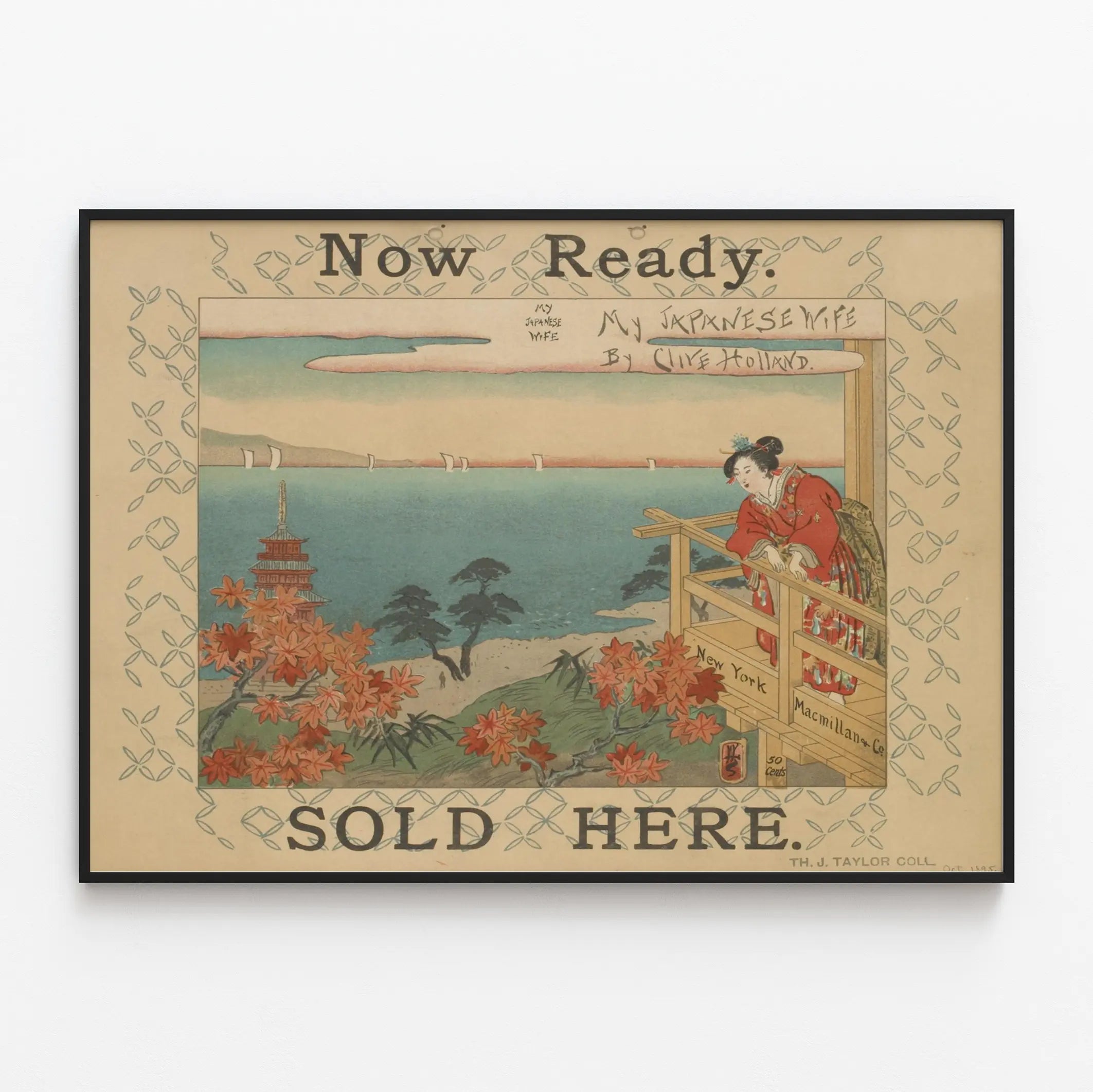 Poznaj tę plakat vintage zatytułowany "My Japanese Wife", ilustrację autorstwa Clive'a Hollanda, która uchwyca elegancję i spokój tradycyjnej sceny japońskiej. Ta dekoracja ścienna, inspirowana japońską estampą, przedstawia kobietę ubraną w bogato zdobiony czerwony kimono, stojącą na drewnianym balkonie nad spokojnym pejzażem morskim. W tle widać panoramę łączącą morze i naturę z drzewami, typową pagodą oraz białymi żaglówkami na spokojnej wodzie, co wywołuje atmosferę zarówno egzotyczną, jak i nostalgiczną. Paleta barw obejmuje delikatne i naturalne odcienie, z niuansami niebieskiego, zielonego, pomarańczowego i czerwonego, tworząc harmonijny i uspokajający efekt. Ten stary plakat jest oprawiony w dekoracyjną ramę z powtarzającym się geometrycznym motywem, który podkreśla jego retro urok, jednocześnie eksponując główne dzieło. Napisy po angielsku "Now Ready", "Sold Here" oraz nazwa wydawcy "New York Macmillan & Co." dodają autentyczności i kontekstu historycznego temu unikalnemu elementowi dekoracji ściennej. Idealny dla miłośników japońskiej sztuki i pasjonatów vintage'owego designu, ten obraz doskonale nadaje się do upiększania przestrzeni życiowych, salonów czy biur, które chcą wprowadzić atmosferę zen i kultury. Plakat "My Japanese Wife" to dzieło dekoracyjne, które zachęca do podróży i kontemplacji, subtelnie łącząc tradycję z dawną estetyką. Wyrafinowany wybór, aby wzbogacić swoją kolekcję plakatów lub dodać odrobinę egzotyki i elegancji do wnętrza.