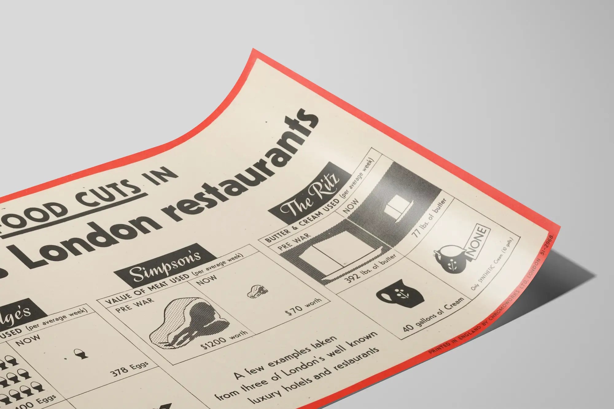 Ta plakat vintage graficznie ukazuje zmniejszenie ilości składników używanych w trzech najbardziej znanych restauracjach i hotelach luksusowych Londynu: Claridge's, Simpson's i The Ritz. Prezentowana jako dekoracja ścienna w stylu retro, ilustruje ilości jajek, cukru, mięsa, masła i śmietany spożywanych średnio co tydzień przed wojną i w obecnych czasach, ukazując spektakularny spadek tych ilości. Dla Claridge's, plakat przedstawia średnie tygodniowe zużycie jajek i cukru, z 9 100 jajek i 700 funtów cukru przed wojną, w porównaniu do 378 jajek i 180 funtów cukru dzisiaj. Simpson's wyróżnia wartość pieniężna używanego mięsa, która spadła z 1 200 dolarów do zaledwie 70 dolarów. Na koniec, The Ritz ilustruje zużycie masła i śmietany: 392 funty masła przed wojną w porównaniu do 77 dzisiaj, podczas gdy naturalna śmietana ustępuje miejsca śmietanie syntetycznej. Ten historycznie inspirowany plakat jest idealnym elementem dekoracji ściennej, wnosząc vintage'owy i informacyjny akcent do kuchni, jadalni lub przestrzeni gastronomicznej. Jego minimalistyczny, graficzny design i kontrasty czerni i bieli na jasnym tle harmonizują z różnymi stylami wnętrz. Ta plakat jest doskonała dla miłośników historii kulinarnej i autentycznej dekoracji, oferując wizualny wgląd w zmiany w diecie w ikonicznych miejscach. Plakat, afisz lub dekoracja ścienna, elegancko podkreśla przestrzeń i stanowi trafne nawiązanie do historii luksusowych restauracji w Londynie.
