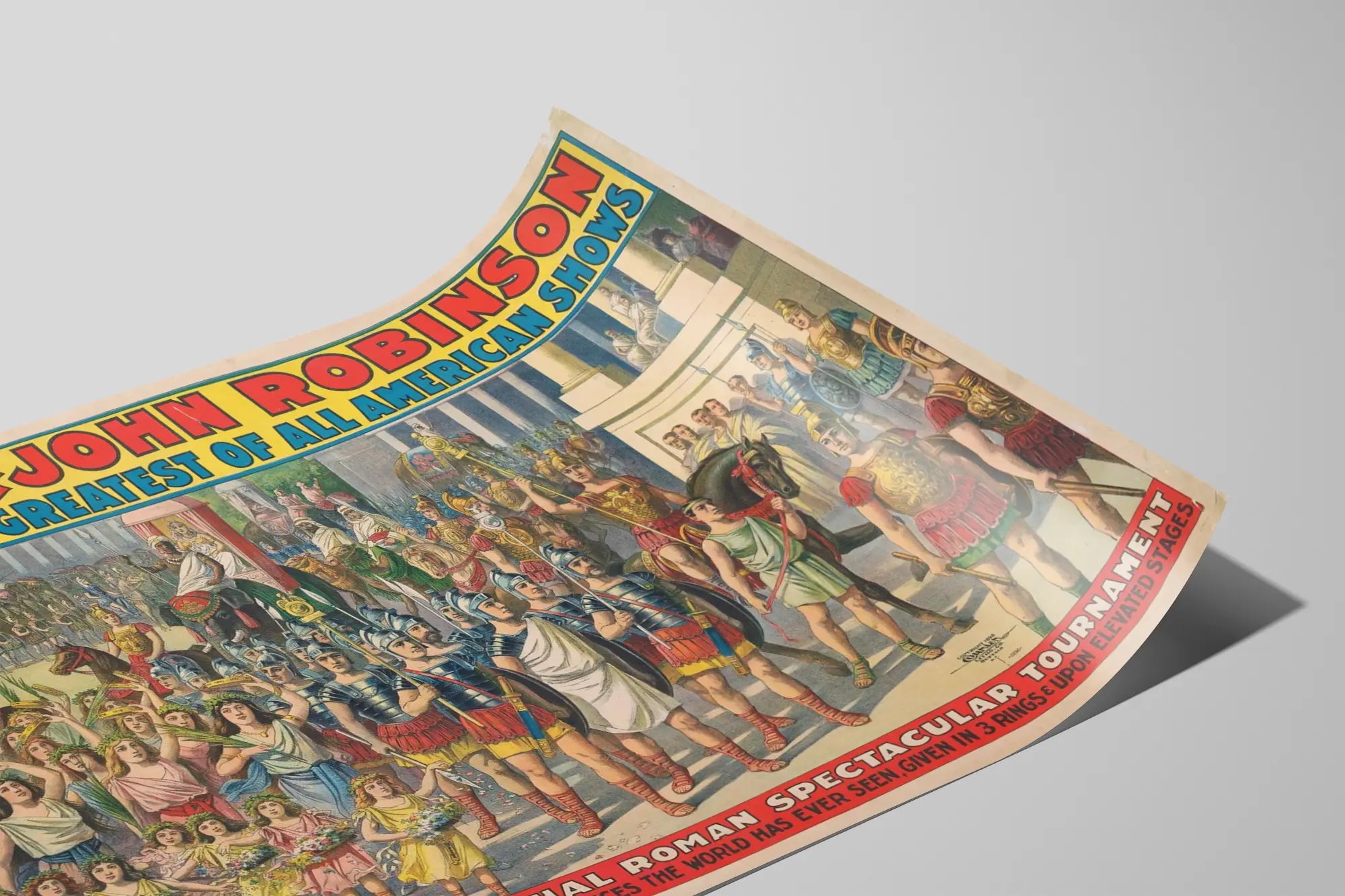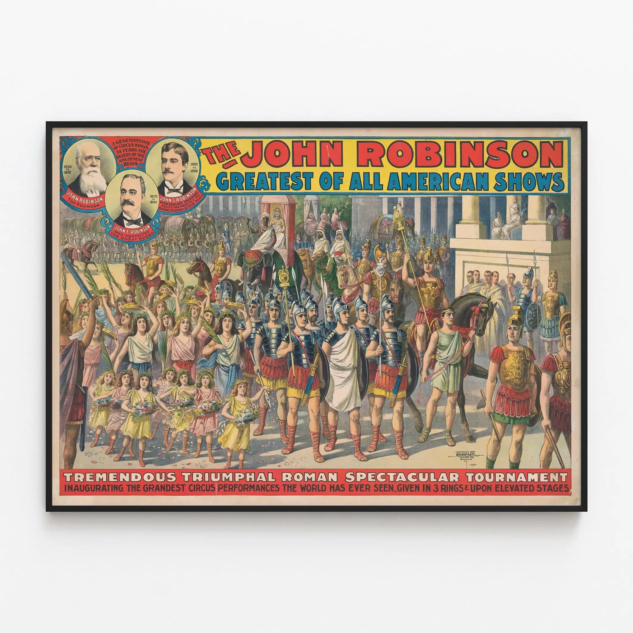 Ta spektakularna plakat vintage przedstawia „The John Robinson Greatest of All American Shows”, wspaniałe przedstawienie teatralne inspirowane starożytnym Rzymem. Wydrukowana w jaskrawych kolorach, ukazuje majestatyczną procesję z rzymskimi żołnierzami w odświętnych strojach, jeźdźcami i różnorodną publicznością, w której znajdują się dzieci i dorośli trzymający kwiaty i palmy, co przywołuje atmosferę uroczystą i podniosłą. Ta dekoracja ścienna wyraźnie nawiązuje do stylu klasycznych plakatów przedstawiających widowiska i cyrki amerykańskie z końca XIX wieku, łącząc odważną typografię z dynamicznymi scenami. W lewym górnym rogu znajdują się trzy legendarne portrety rodziny Robinson, założycieli i mistrzów cyrku, opatrzone informacyjnymi tekstami, podkreślającymi historyczny i dziedzictwa charakter plakatu. Dolna część prezentuje wydarzenie zatytułowane „Tremendous Triumphal Roman Spectacular Tournament”, zapowiadające niezwykłe występy w trzech kręgach i na podniesionych scenach. Ta plakat jest wyjątkowym elementem dekoracji ściennej, idealnym dla miłośników historii widowisk, tradycyjnego cyrku lub stylu retro. Szczegółowa grafika i bogata ikonografia czynią z niego fascynujący element dekoracyjny do salonu, pokoju gier lub biura. Plakat lub afisz, ten obrazek ukazuje odtworzony starożytny spektakl, mający zachwycić widzów, jednocześnie oddając hołd dynastii Robinson, słynnej w świecie rozrywki. To wydrukowany element dekoracyjny, który przyciągnie wzrok i wzbogaci wnętrze o wyraźny akcent kulturalny i artystyczny.