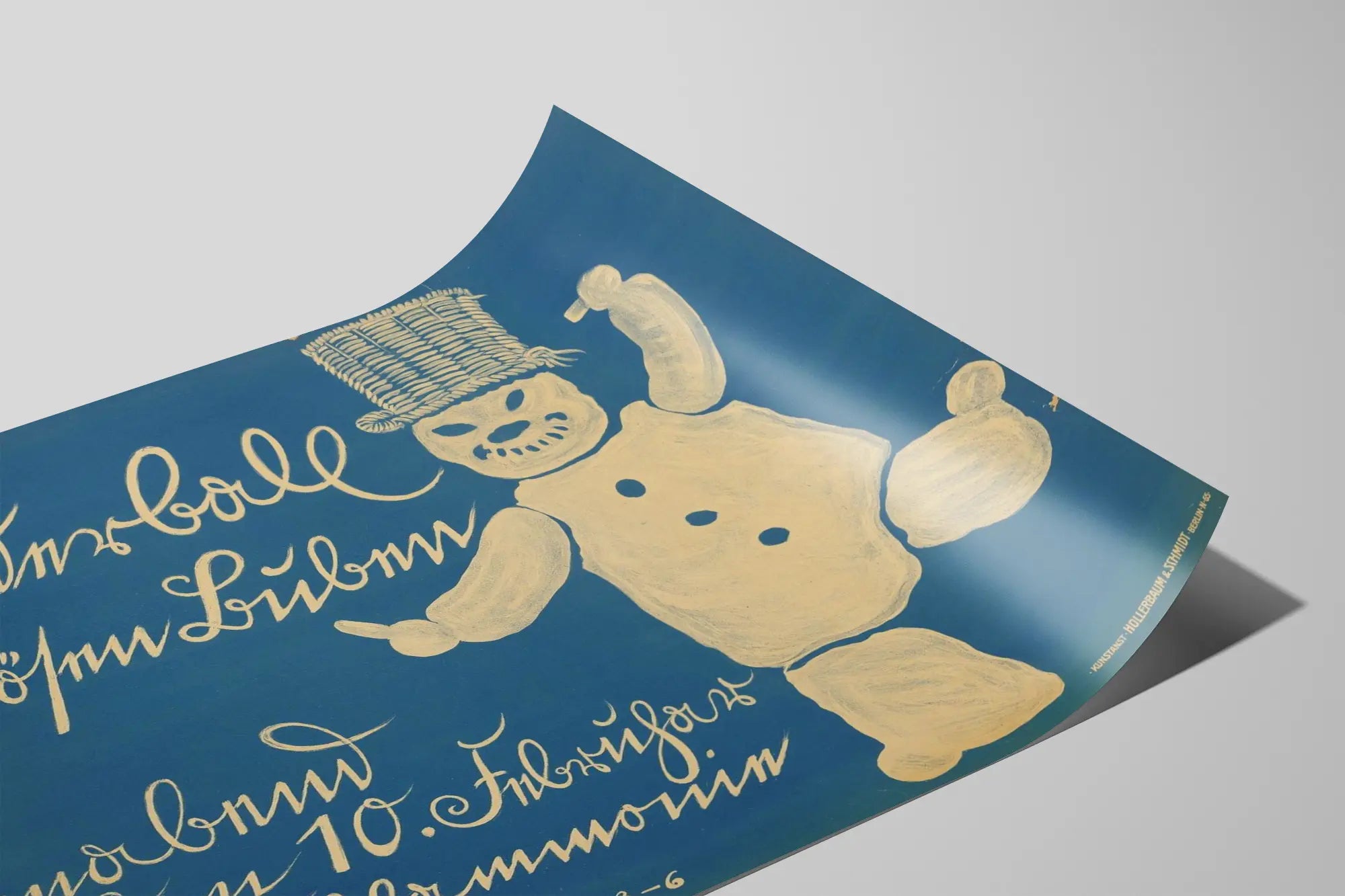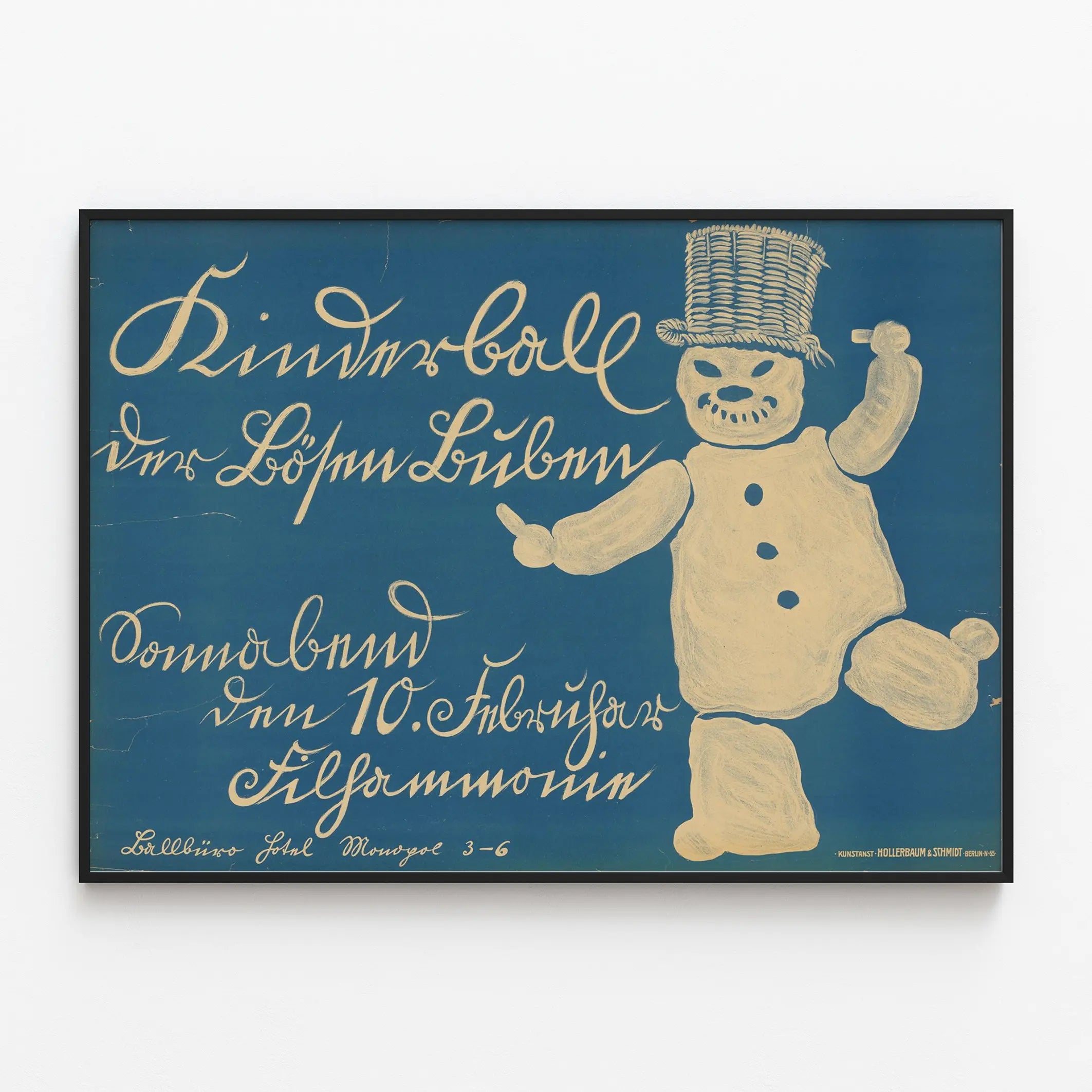 Ta vintage plakat, zatytułowany „Kinderball der Bösen Buben”, prezentuje ikoniczną grafikę w odcieniach niebieskiego i kremowego, zarazem zabawną i nietuzinkową. Ukazuje stylizowaną, niemal karykaturalną postać w kształcie bałwana lub ruchomej lalki, z cylindrem na głowie i uśmiechem o wyraźnych rysach. Ten unikalny design łączy atmosferę dziecięcą z nutą tajemniczości, stanowiąc idealną dekorację ścienną pełną charakteru.