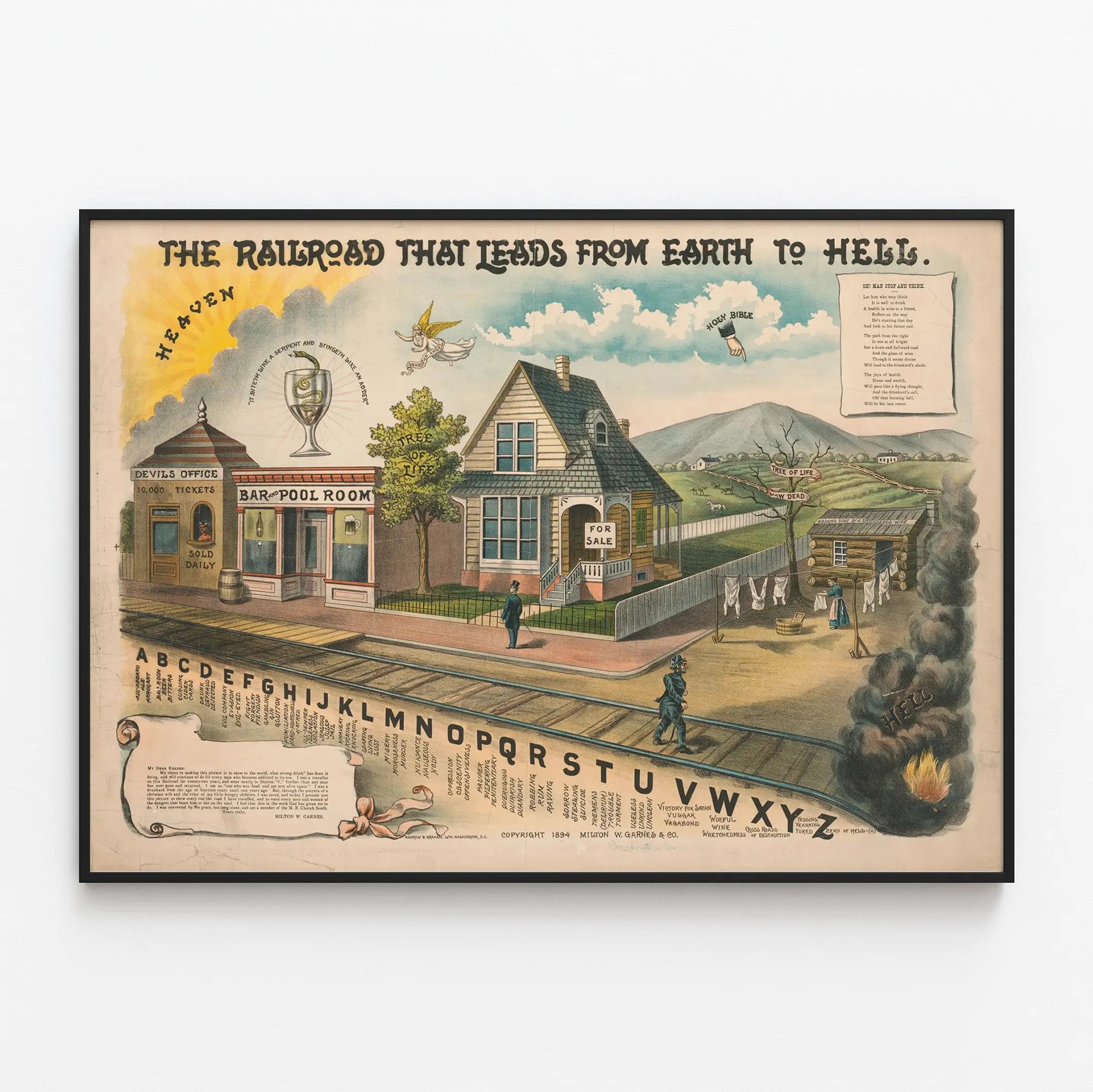 Ta plakat vintage zatytułowany „Droga Kolejowa Prowadząca Z Ziemi do Piekła” jest oryginalną i symboliczną ilustracją przedstawiającą moralną ścieżkę w formie torów kolejowych prowadzących z Ziemi do Piekła. Ten fascynujący plakat wyróżnia się stylem retro i szczegółową grafiką, łącząc elementy wizualne i tekstowe w unikalnym narracyjnym kontekście. Stanowi część dekoracji ściennych, które dodają autentyczności i historii każdemu wnętrzu.