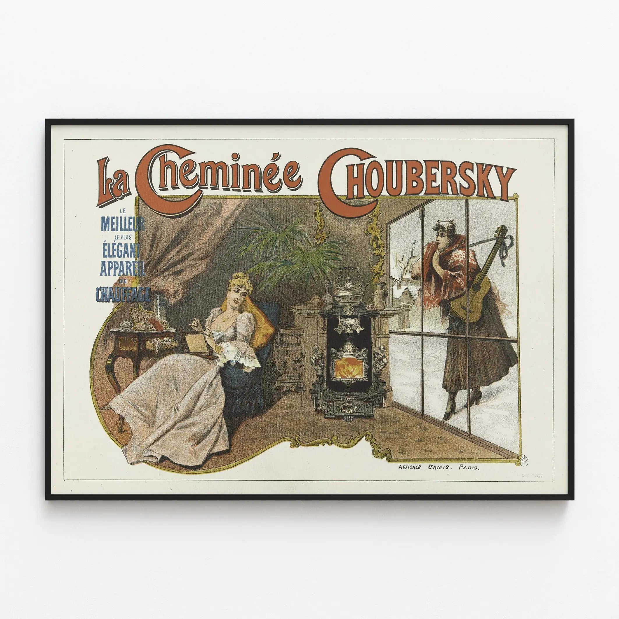 Wprowadź do swojego wnętrza odrobinę retrouroku dzięki tej plakatowej reprodukcji „La Cheminée Choubersky”. Ta dekoracja ścienna przedstawia elegancką, starą reklamę urządzenia grzewczego, ukazaną z finezją i dbałością o szczegóły. Plakat ukazuje ciepłą i wyrafinowaną scenę, w której kobieta w białej sukni wygodnie siedzi przy funkcjonalnym i ozdobnym kominku, podczas gdy inna młoda kobieta, owinięta w płaszcz i trzymająca gitarę, zdaje się podziwiać scenę przez okno.