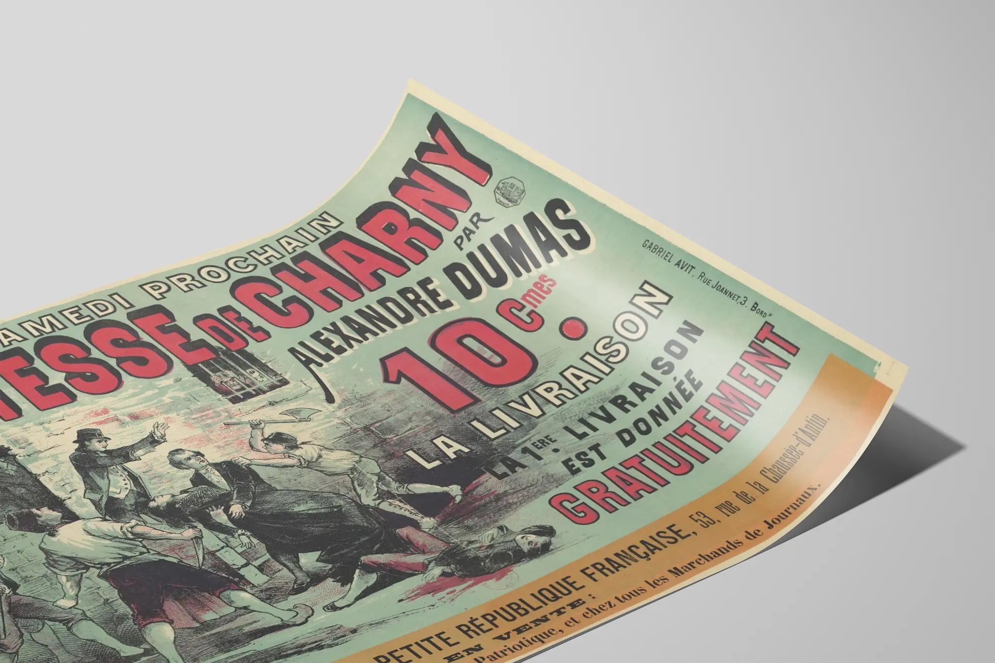 Ta vintage plakat zapowiada nadchodzącą premierę powieści "Hrabina z Charny" autorstwa Aleksandra Dumasa. Ikoniczny plakat, który nawiązuje do starożytnego stylu graficznego, gdzie tytuł jest wyróżniony przyciągającymi uwagę czerwonymi i czarnymi literami na jasnym tle, dodając retro akcent do Twojej dekoracji ściennej. Ilustracja w centrum przedstawia dramatyczną i pełną życia scenę, ukazującą grupę postaci w pełnej konfrontacji wokół mężczyzny w kostiumie, podkreślając intensywność opowieści. To dzieło emanuje atmosferą historyczną i literacką, idealną dla miłośników klasycznej literatury i vintage'owego designu. Ta literacka reprodukcja wywołuje również klimat typowy dla małych francuskich republik, z tekstem promocyjnym ogłaszającym darmową pierwszą dostawę powieści, podkreślając jej starożytny i autentyczny charakter. Doskonały element dekoracyjny do personalizacji przestrzeni do czytania, biura lub salonu, wnoszący odrobinę historii i kultury bezpośrednio na Twoje ściany. Cały wizualny projekt wykorzystuje kontrastujące kolory, które przyciągają wzrok, pozostając jednocześnie harmonijne, co czyni go atrakcyjną i historyczną dekoracją ścienną. Wybierz ten unikalny plakat, aby podkreślić swoje wnętrze za pomocą elementu dekoracyjnego, który opowiada historię i oddaje hołd pióru Aleksandra Dumasa.