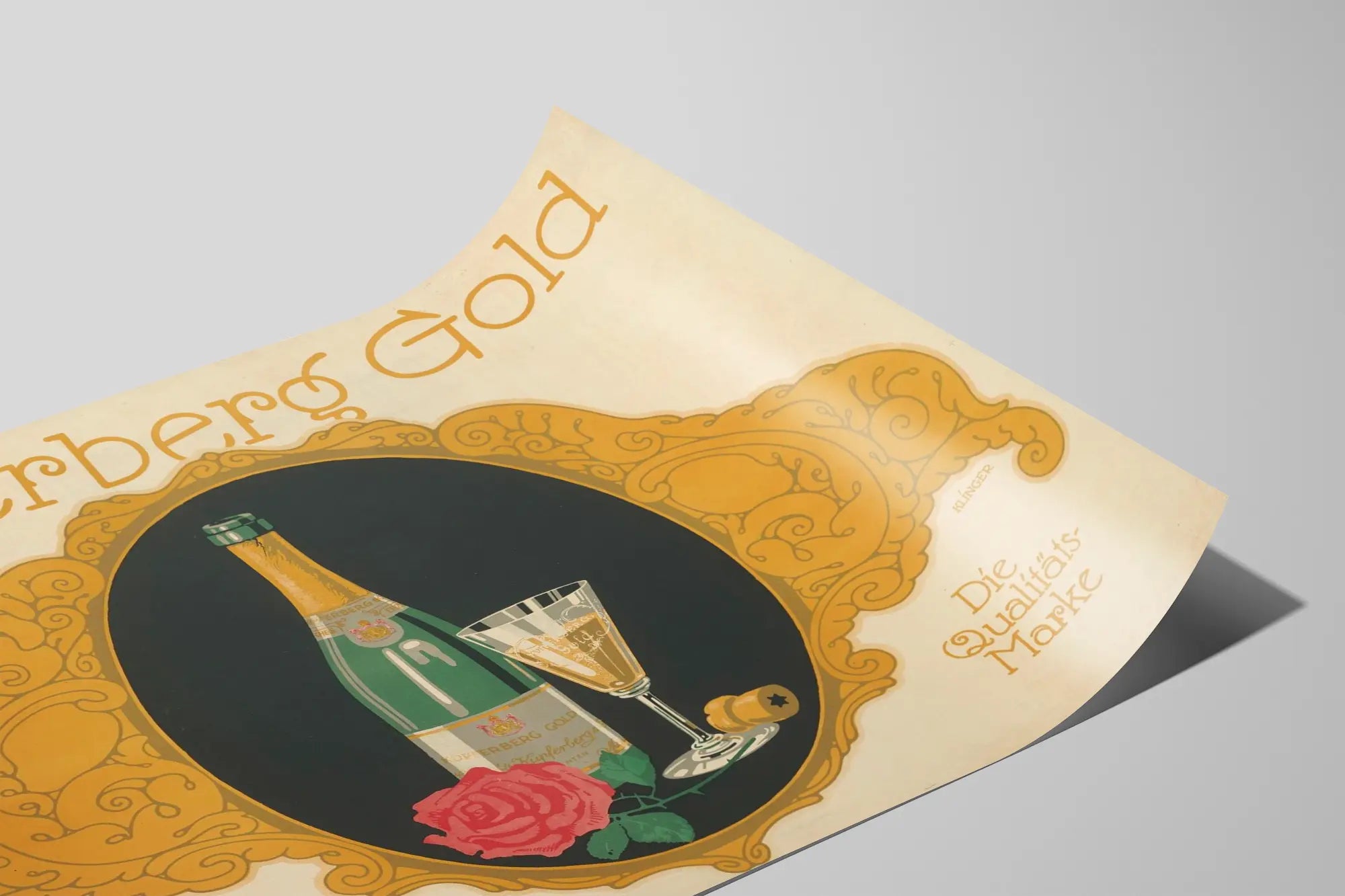 Napisy w języku niemieckim „Leicht Trocken Elegant” oraz „Die Qualitäts-Marke” dodają autentycznego charakteru tej plakatowej reklamy z epoki, podkreślając wysoką jakość i wyrafinowanie promowanego produktu. Zrównoważona kompozycja i wybór ciepłych barw w odcieniach złotego pomarańcza, zieleni i czerwieni dla butelki i róży wzmacniają prestiżowy charakter tego obrazu.