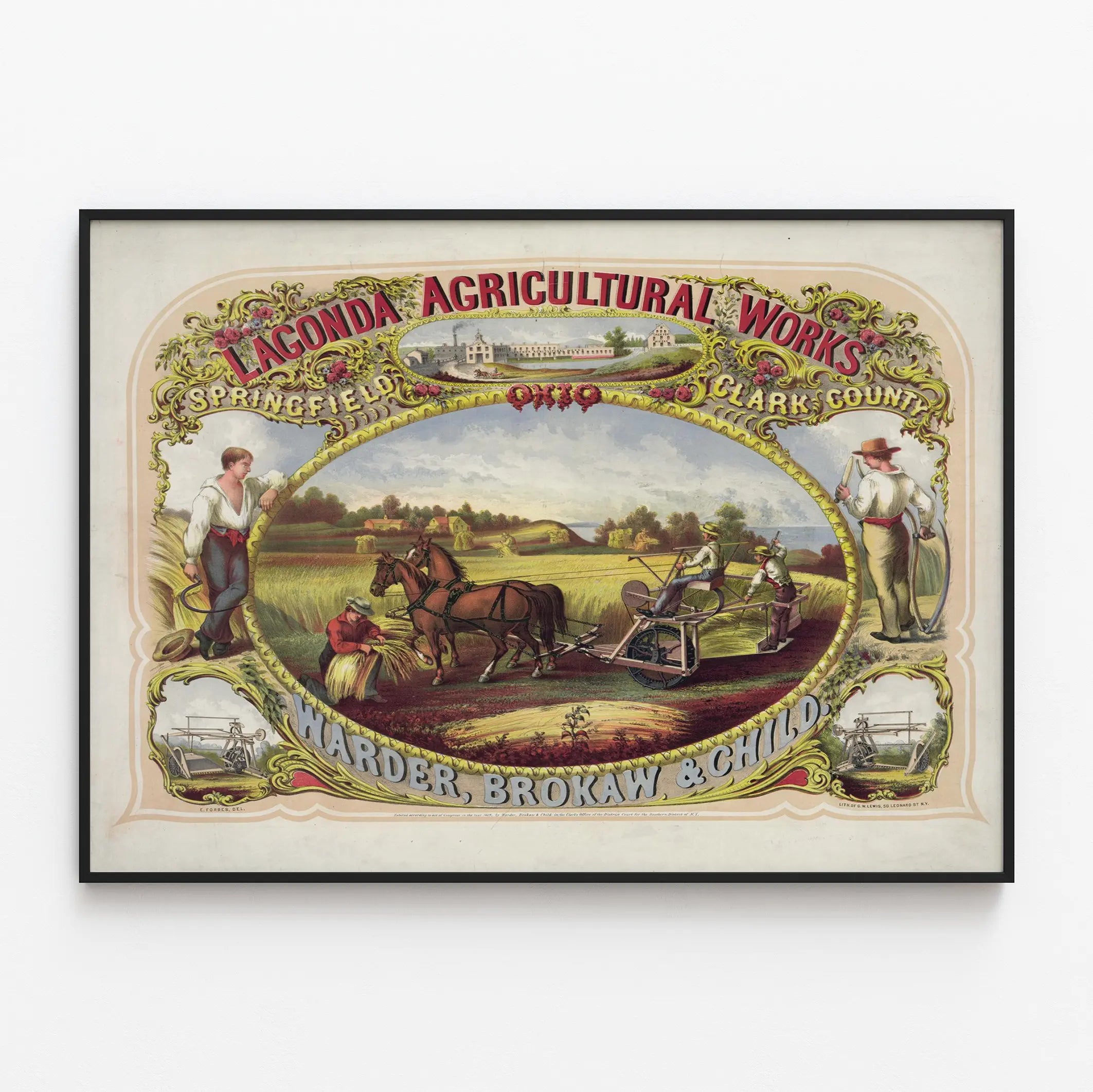 Tytuł „Lagonda Agricultural Works Springfield Clark County Ohio” umieszczony na górze przyciąga uwagę czerwonymi i złotymi literami, otoczonymi szczegółowym kwiatowym ornamentem. Na dole, nazwa „Warder, Brokaw & Child” jest przedstawiona dużymi literami, co prawdopodobnie odnosi się do producenta lub dystrybutora tych urządzeń rolniczych. Owalna rama otaczająca scenę dodaje estetycznego, klasycznego akcentu, który doskonale wpasuje się w vintage’ową lub rustykalną dekorację.