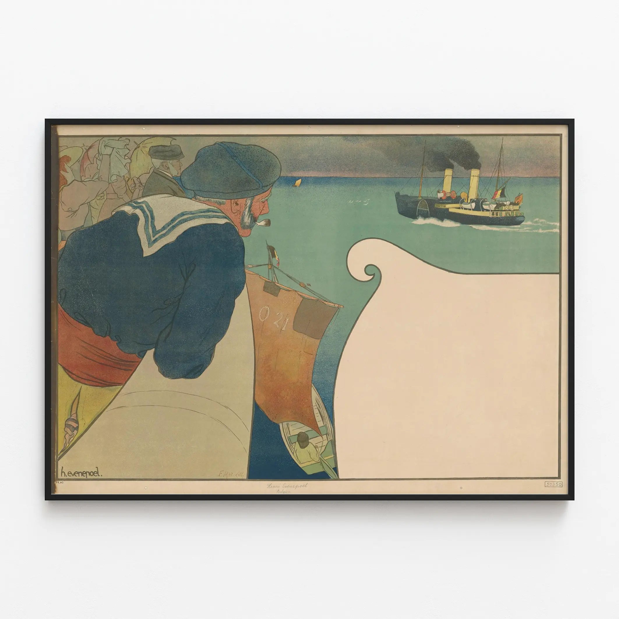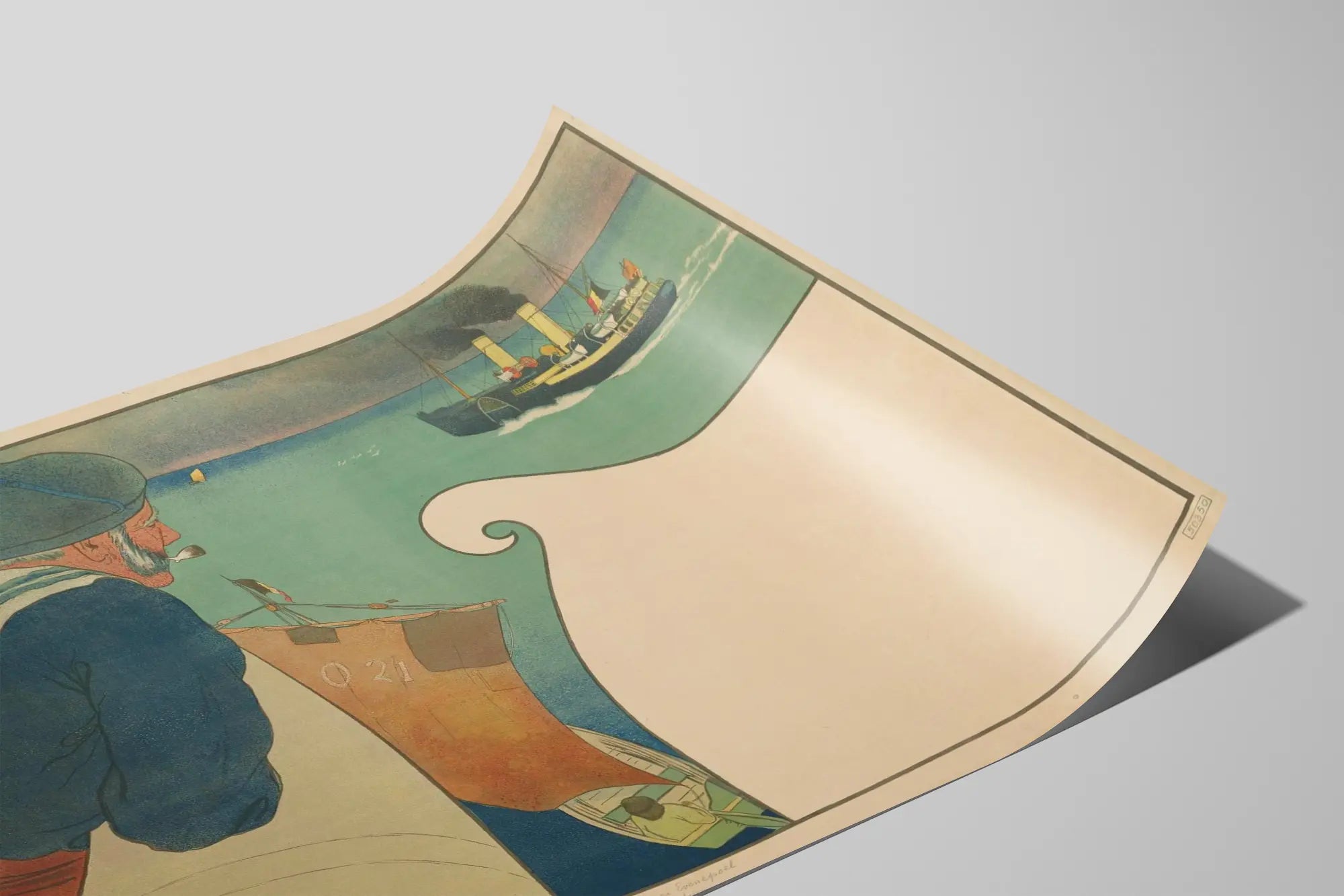 Ta plakat vintage przedstawia scenę morską ilustrującą połączenie pocztowe między Ostendą a Doverem. Jej styl graficzny nawiązuje do minionej epoki i oferuje unikalny wgląd w życie morskie poprzez autentyczną dekorację ścienną. Widać na niej marynarza na pierwszym planie, ubranego w sweter morski i beret, patrzącego w kierunku morza, gdzie stary parowiec dymi z kominów. Całość utrzymana jest w delikatnych, naturalnych odcieniach, z wyważoną kompozycją pomiędzy postaciami na brzegu nabrzeża a spokojnym oceanem. Ten plakat jest idealny, aby dodać retro i morskiego charakteru do wnętrza, niezależnie od tego, czy w salonie, sypialni czy biurze. Doskonale sprawdzi się u miłośników dekoracji ściennych o tematyce morskiej, podróżniczej lub starych plakatów. Szeroka pusta przestrzeń po prawej stronie może również służyć do dodania tekstu lub spersonalizowanego napisu, czyniąc z niego wyjątkowy element na wystawę lub kolekcję. Finezja linii i subtelna paleta użytych kolorów podkreślają ten element dekoracyjny i świadczą o historycznym stylu graficznym związanym z plakatami komunikacji morskiej. Ten obraz na ścianę skierowany jest do pasjonatów historii morskiej i vintage’owego designu graficznego, którzy chcą udekorować wnętrze oryginalnym i pełnym znaczenia elementem. W zakresie dekoracji, ta plakat stanowi doskonałe połączenie estetyki i autentyczności, pozwalając na wprowadzenie morskiego i nostalgicznego nastroju do każdego wnętrza.