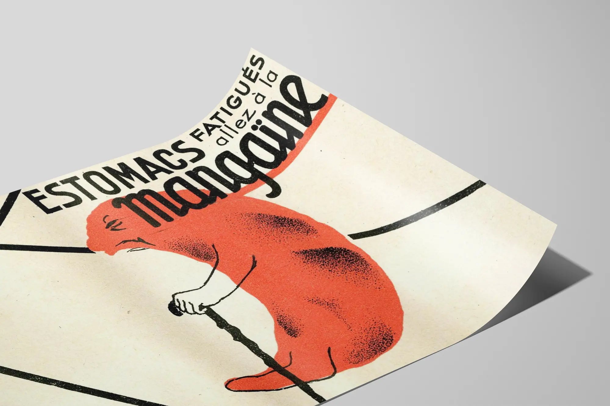 Odkryj tę unikalną plakat vintage zatytułowany "Mangäine", wyjątkowy element dekoracji ściennej pełen charakteru i oryginalności. Ten stary plakat reklamowy przedstawia stylizowaną, antropomorficzną reprezentację żołądka, namalowaną na czerwono, z postacią używającą laski, symbolizującą zmęczony żołądek. Kompozycja graficzna opiera się na silnym kontraście między czerwienią a czernią na jasnobeżowym tle, co nadaje autentyczną estetykę retro, która z pewnością przypadnie do gustu miłośnikom vintage’owych dekoracji ściennych i nietypowych elementów.