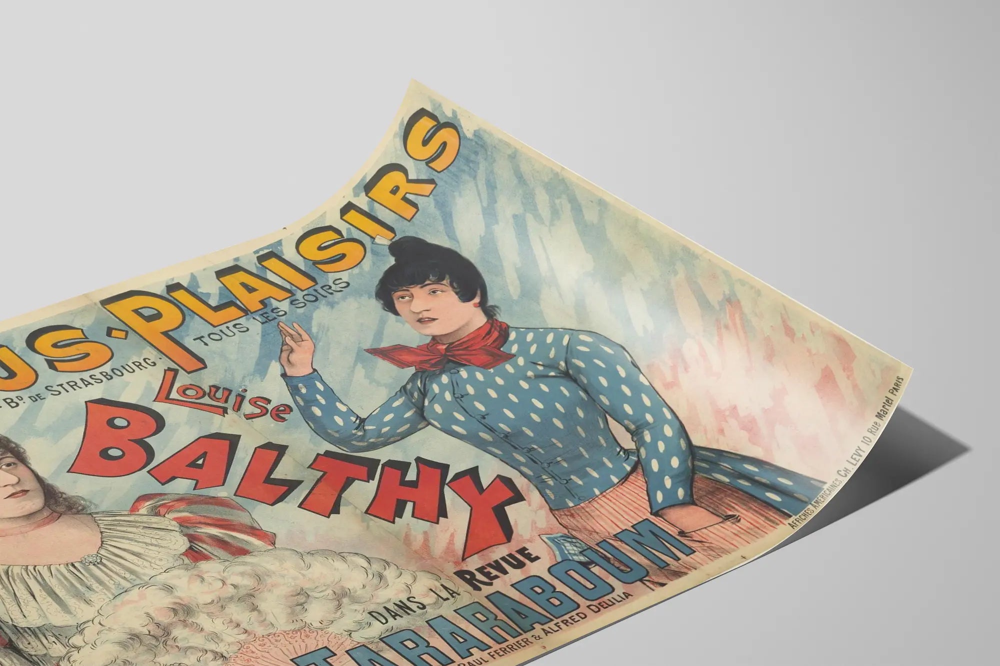 Odkryj ten autentyczny druk artystyczny vintage zatytułowany „Menus Plaisirs tous les soirs”, przedstawiający Louise Balty w rewii Taraboum. Ten historyczny plakat reklamowy jest idealnym elementem dekoracji ściennej dla miłośników sztuki graficznej i starych plakatów. Starannie odtworzony, ten druk artystyczny ukazuje dwie eleganckie kobiety w kostiumach z epoki, z pastelowymi kolorami i drobiazgowymi detalami, tworząc wizualnie porywające dzieło. Ta retro dekoracja ścienna odzwierciedla urok i estetykę bulwaru Strasbourga, ikonicznego miejsca życia paryskiego. Plakat wnosi zarówno artystyczny, jak i nostalgiczny akcent, doskonały do ozdoby salonu, jadalni lub przestrzeni kulturalnej. Jego styl graficzny i delikatne kolory czynią z niego element dekoracyjny, który harmonijnie wpisuje się w różne wnętrza, dodając vintage’owego i wyrafinowanego nastroju. Ten obraz na ścianę wyróżnia się starożytnymi typografiami, szczegółowymi ilustracjami i unikalnym charakterem, który przywołuje dawny paryski spektakl, uchwycając ducha minionej epoki. Druk na ścianę, plakat lub obraz, ten druk artystyczny jest idealny do wzbogacenia kolekcji dekoracji ściennych lub do nadania przestrzeni historycznego i artystycznego klimatu. Doskonały wybór dla tych, którzy poszukują oryginalnego i pełnego charakteru elementu, symbolizującego elegancję paryskiej sceny kulturalnej poprzez występ i spektakl.