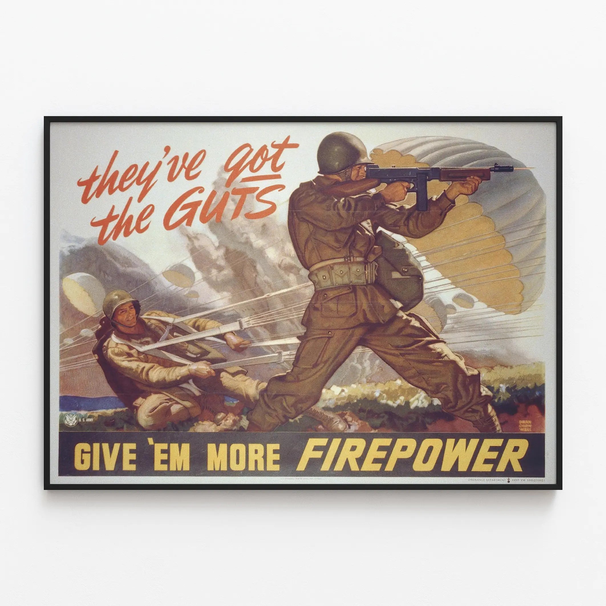 Plakat vintage militarystyczny „Daj im więcej siły ognia”
