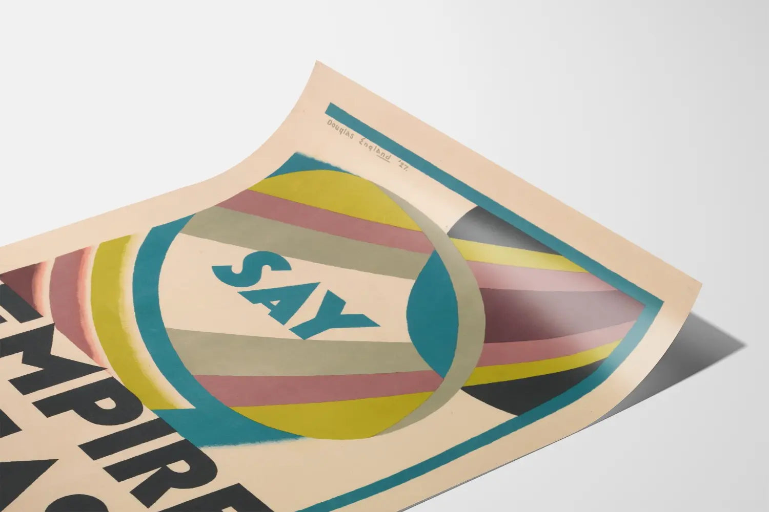 Poznaj tę vintage plakat zatytułowany "Say Empire Please", prawdziwy element dekoracji ściennej oferujący unikalny styl retro. Ten plakat wyróżnia się graficznym układem opartym na geometrycznych kształtach, z eliptycznymi formami i kolorowymi promieniami w odcieniach żółci, różu, niebieskiego i szarego, wszystko otoczone niebieską ramką, która strukturyzuje całość. Czarny, wielkimi literami napis w mocnym, kontrastowym stylu typograficznym zachęca do interakcji z przekazem "Say Empire Please", umieszczonym na środku plakatu.