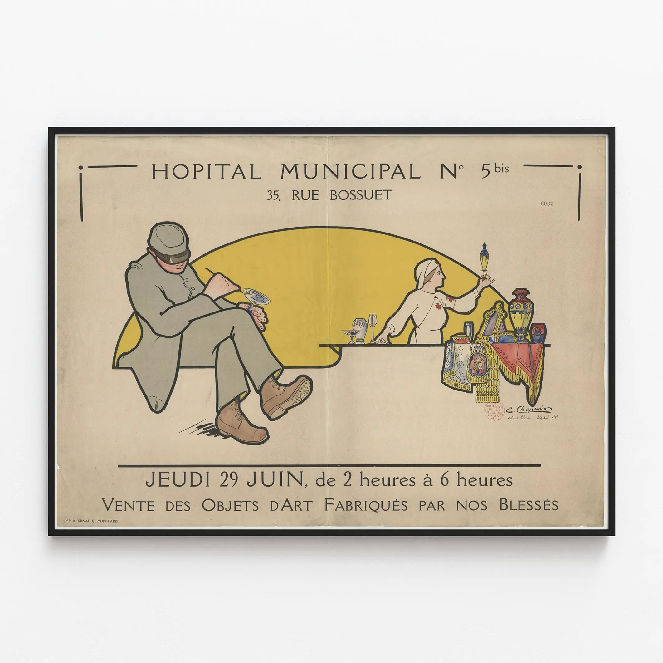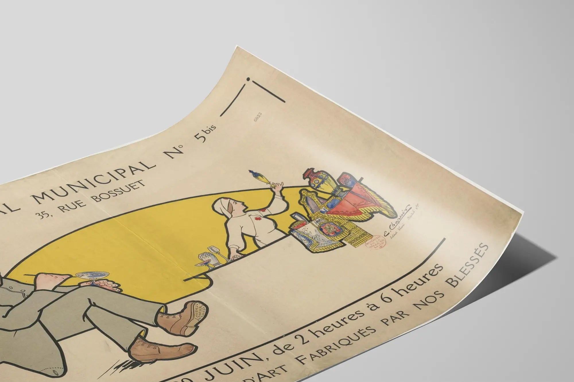 Ten stary plakat, zaprojektowany w celu promowania sprzedaży dzieł sztuki wykonanych przez weteranów wojennych, jest uderzającym przykładem historycznej dekoracji ściennej. W minimalistycznym stylu graficznym i stonowanych kolorach przedstawia żołnierza w mundurze, malującego przedmiot dekoracyjny, podczas gdy pielęgniarka prezentuje wazon na bogato zdobionym stole. Ten plakat jest idealny dla miłośników vintage'owych dekoracji ściennych oraz tych, którzy cenią historyczne afisze o silnym charakterze wizualnym i ludzkim. Napis na górze wskazuje, że wydarzenie odbywa się w Szpitalu Miejskim nr 5bis przy ulicy Bossuet 35, podkreślając dokładne miejsce tej artystyczno-społecznej akcji. Na dole plakatu wyświetlona jest data i godzina sprzedaży: „Czwartek, 29 czerwca, od 14 do 18”, nadając scenie precyzyjny kontekst czasowy. To dzieło łączy przesłanie dobroczynności poprzez solidarność z rannymi oraz zaproszenie do odkrywania unikalnych, ręcznie wykonanych dzieł sztuki w szpitalnym otoczeniu. Doskonałe do oprawienia jako obraz dekoracyjny, ten plakat przekazuje silny przekaz, jednocześnie wzbogacając przestrzeń wnętrza o odrobinę autentyczności i historii. Jako dekoracja ścienna, skierowany jest do kolekcjonerów starych afiszy, pasjonatów sztuki oraz wszystkich, którzy pragną wprowadzić do wnętrza klimat retro z głębokim przesłaniem, związanym z odpornością i kreatywnością w czasie wojny.