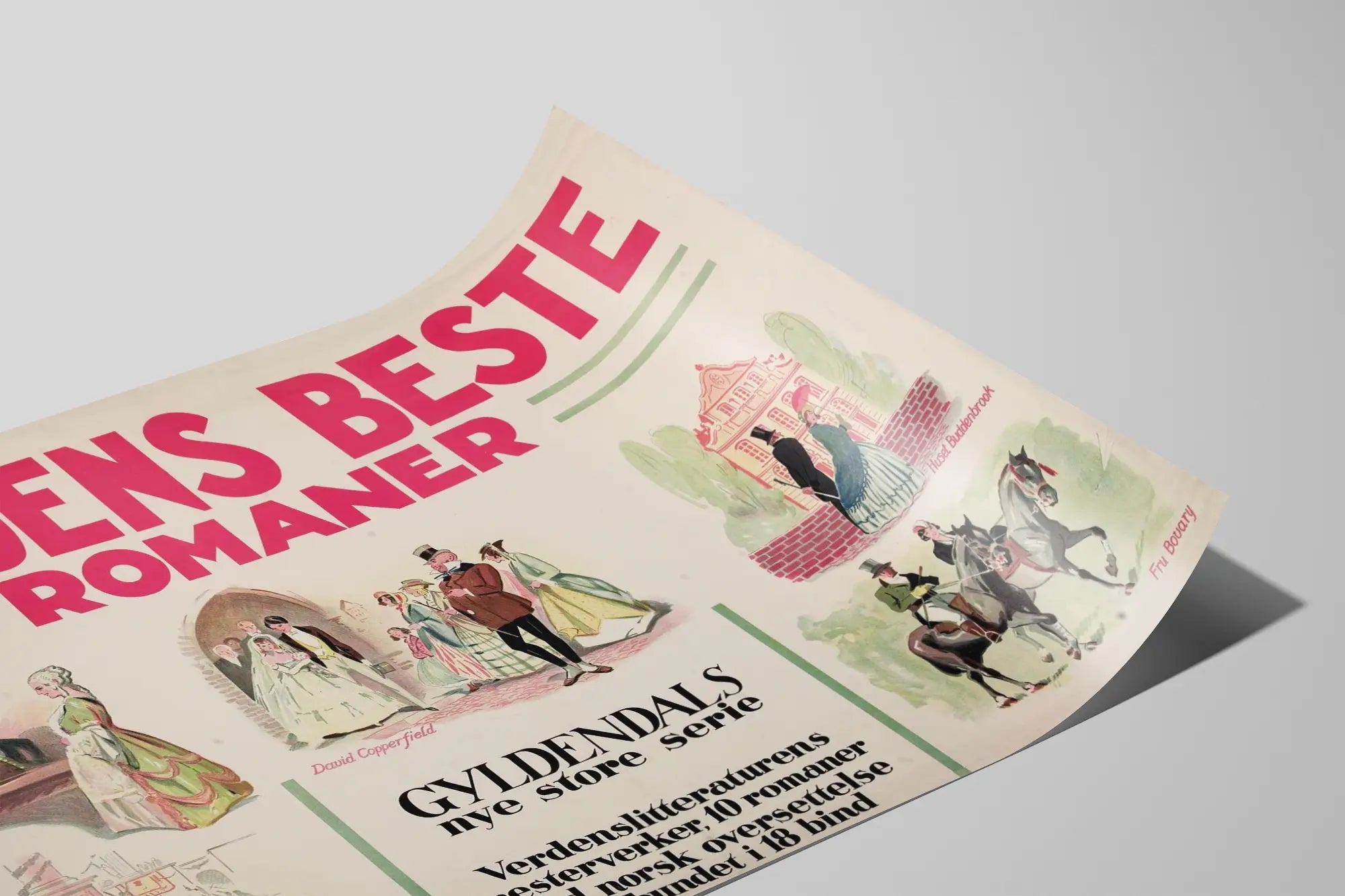 Ta vintage plakat zatytułowany „Verdens Beste Romaner” to dekoracyjny element na ścianę, który zachwyci miłośników literatury i stylu retro. Plakat przedstawia serię klasycznych powieści przetłumaczonych na norweski, zilustrowanych wyrafinowanymi scenami ikonicznymi. Na górze widnieje tytuł w czerwonych literach wielkich „VERDENS BESTE ROMANER”, otoczony subtelnymi zielonymi motywami graficznymi, które dodają równowagi i elegancji.
