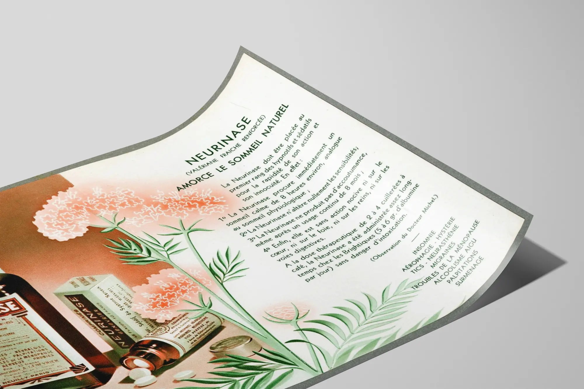 Ta vintage plakat Neurinase to unikalny element dekoracji ściennej w stylu retro i autentycznym. Przedstawia starą reklamę Neurinase, leku na bazie świeżej waleriany, chwalonego za naturalny efekt wywołujący sen. Ten plakat reklamowy precyzyjnie ilustruje butelki i opakowania tej tradycyjnej farmaceutycznej preparacji, uzupełnione delikatnym rysunkiem kwiatów, nawiązującym do rośliny użytej w formule. Tekst zawiera informacje o korzyściach przypisywanych Neurinase, w tym o wywoływaniu spokojnego i naturalnego snu trwającego około ośmiu godzin, bez uzależnienia, bez zmiany zmysłów i bez szkodliwego wpływu na serce, wątrobę, nerki czy układ trawienny. Wskazania medyczne wymienione na dole plakatu wskazują na jej zastosowanie w leczeniu bezsenności, aerofagii, histerii, tików, neurastenii, migren, zaburzeń menopauzy, ostrego alkoholizmu, palpitacji i nadmiernego wysiłku. Idealny dla miłośników dekoracji ściennych o tematyce vintage lub medycznej, ten plakat dodaje historycznego i estetycznego charakteru każdemu wnętrzu. Doskonale uzupełnia kolekcję starych plakatów reklamowych lub harmonijnie wpisuje się w wystrój łączący sztukę, botanikę i medycynę tradycyjną. Połączenie precyzyjnej grafiki, wyjaśniającego tekstu i elementów florystycznych tworzy wyjątkową harmonię wizualną, która zachwyci miłośników oryginalnych i pełnych historii przedmiotów dekoracyjnych.