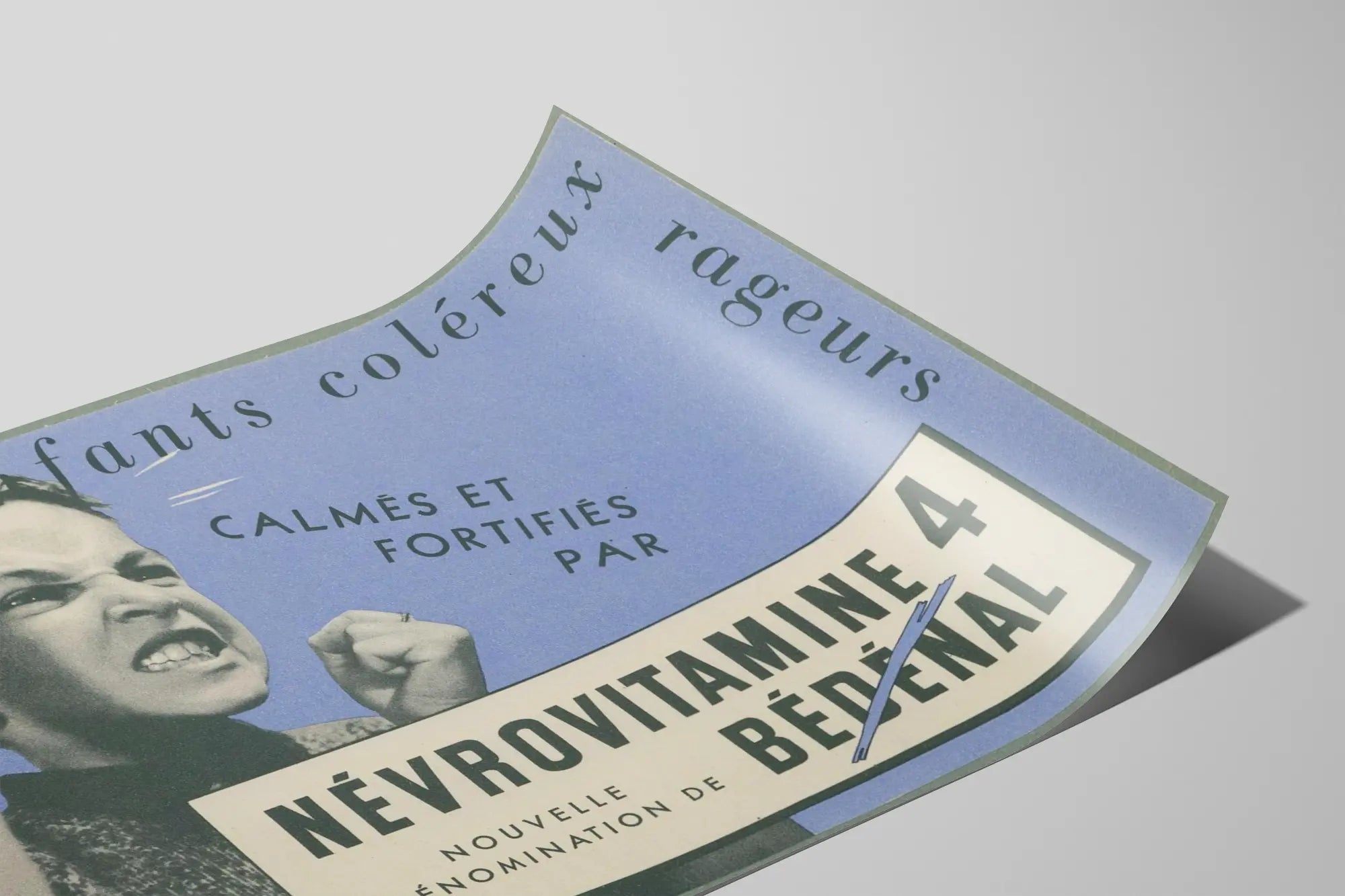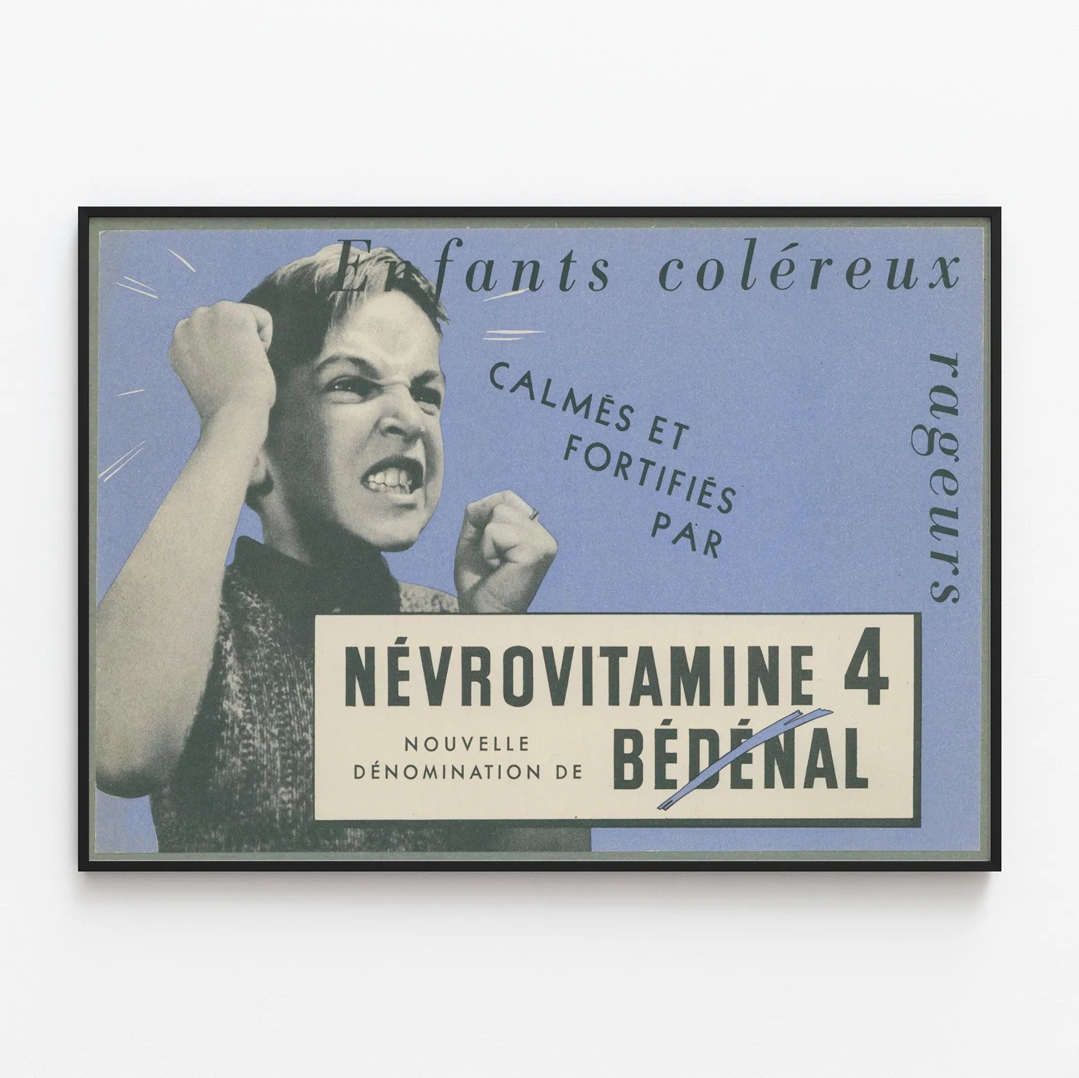 Ta vintage'owa reklama przedstawia zagniewane dziecko z podniesionymi pięściami, ukazując dynamiczny i wyrazisty aspekt dziecięcych emocji. Tło jest jasnoniebieskie, podkreślając czarno-białe zdjęcie chłopca. Otaczający tekst opisuje produkt "Névrovitamina 4", nową nazwę dla Bédénalu, podkreślając jego zastosowanie w uspokajaniu i wzmacnianiu rozgniewanych i gniewnych dzieci. Ten stary plakat nawiązuje do estetyki retro, z różnorodną typografią i kontrastowym układem, który przyciąga uwagę do nazwy leku, wypisanej dużymi czarnymi literami na białym tle. Ta dekoracja ścienna jest idealna dla miłośników designu vintage lub do stworzenia oryginalnej atmosfery z nutą nostalgii i odniesieniem do przeszłości. Styl graficzny i fotograficzny nadaje tej plakacie autentyczny klimat epoki, doskonały do ozdobienia ściany z odrobiną nostalgii i dawnej historii medycznej. Idealna do salonu, poczekalni lub pomieszczenia przeznaczonego na kolekcję plakatów, ta reprodukcja jest unikalnym elementem dekoracji ściennej, pełniącym także funkcję retro inspirującego obrazu. To doskonały wybór dla tych, którzy poszukują plakatu z wyrazistą treścią i zrównoważonym wizualnym efektem między obrazem a tekstem, bardzo reprezentatywnym dla vintage marketingu produktów zdrowotnych dla dzieci.