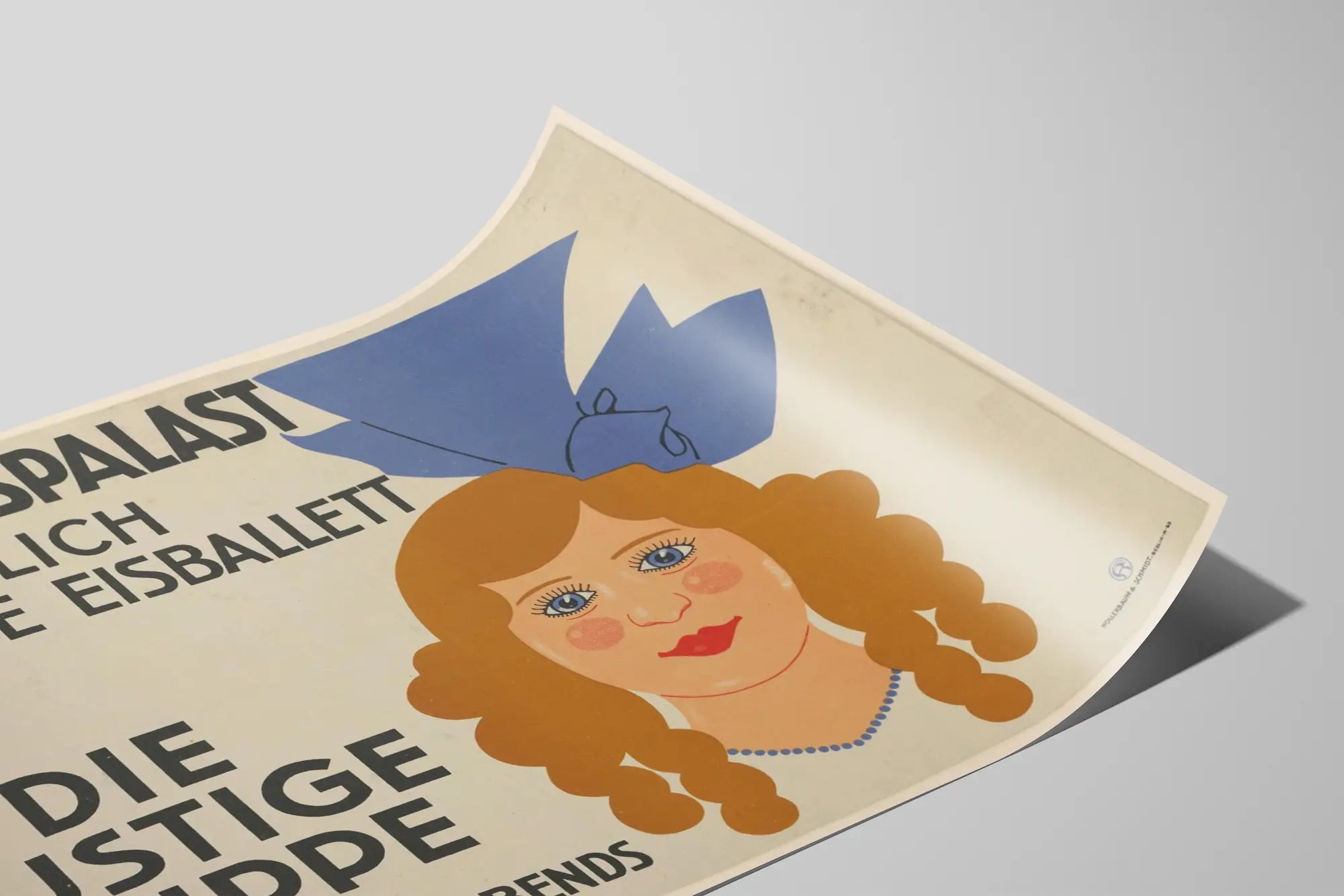 Dodaj odrobinę oryginalności i nostalgii do swojej dekoracji ściennej z tym plakatem vintage zatytułowanym „Nowy Balet na Lodzie: Wesoła Lalka”. Ten plakat reklamowy, o stonowanym i wyrazistym designie graficznym, przedstawia stylizowaną ilustrację uśmiechniętej lalki z kręconymi włosami, uzupełnioną dużym niebieskim kokardą na głowie i perłowym naszyjnikiem. Całość łączy delikatne kolory i tekst w pogrubionej czerni, tworząc elegancką i dynamiczną równowagę wizualną.