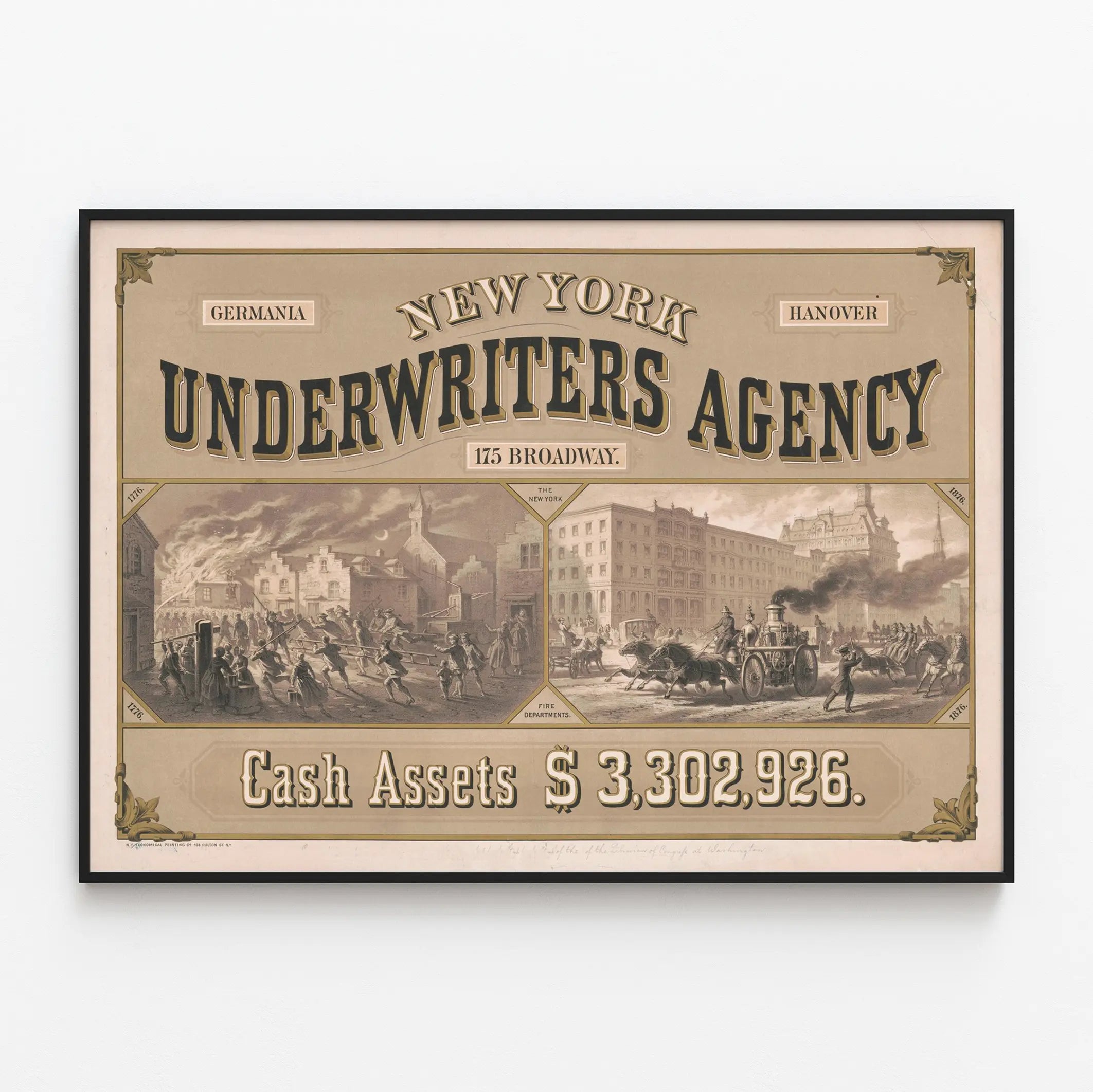 Ta plakatu wpisuje się w styl graficzny, który jest zarówno informacyjny, jak i dekoracyjny, z wypukłymi elementami typograficznymi i paletą naturalnych, delikatnych barw. Rzeźbione ramki na rogach oraz napisy "Germania" i "Hanover" dodają autentyczności i epoki. To doskonały wybór dla miłośników sztuki starej, vintage’owych dekoracji ściennych lub tematyki historycznej związanej z miastem Nowy Jork.
