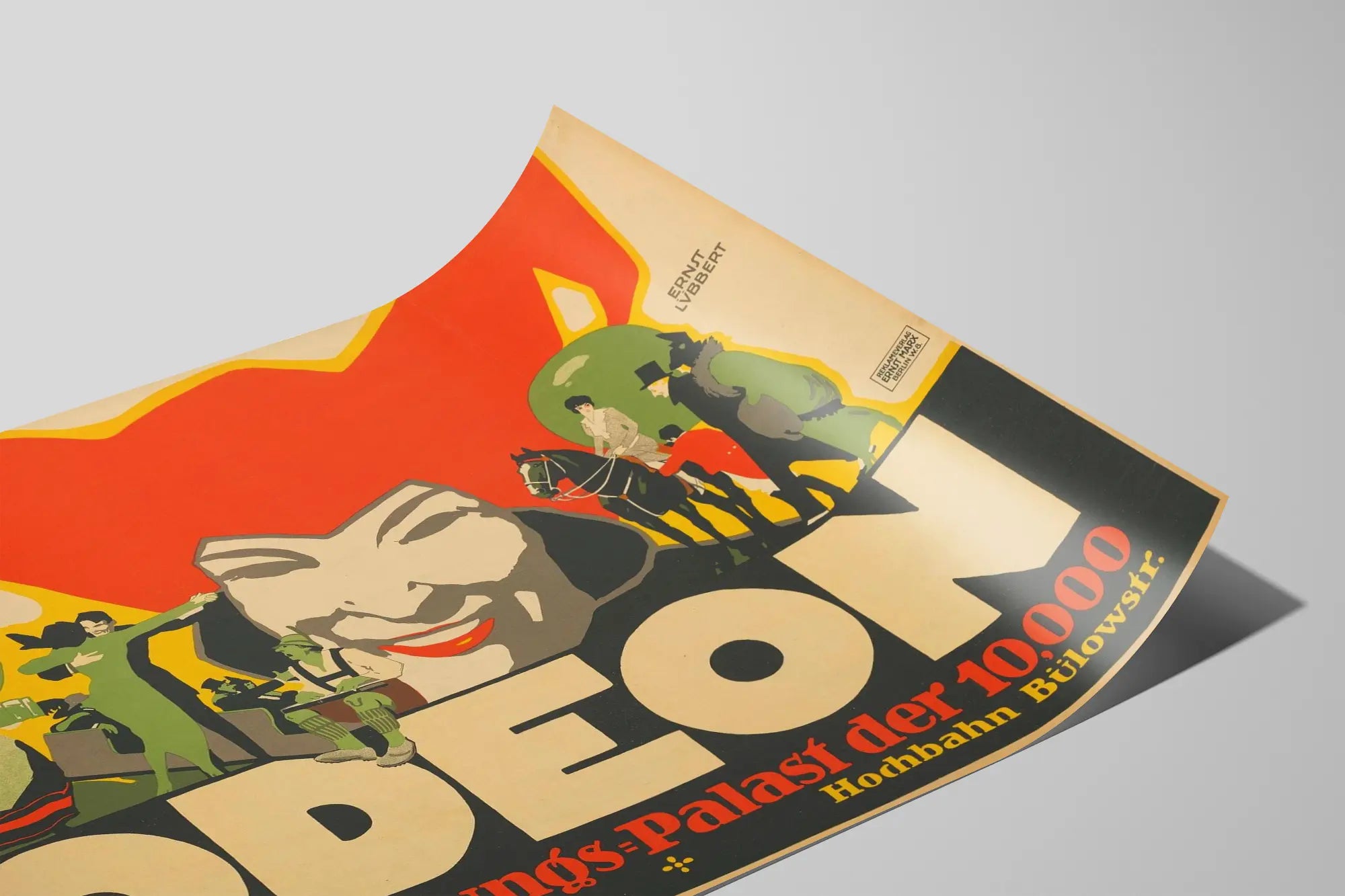 Główny tekst w wielkich literach, „ODEON”, jest wyraźnie widoczny i wpisuje się w graficzny układ o wyraźnych kontrastach, podkreślony przez drugi tekst w języku niemieckim, który nawiązuje do miejsca rozrywki, wzmacniając radosny nastrój tej pracy. Szczegóły postaci – mężczyzna grający na bębnach, kobieta na koniu, mężczyzna w cylindrze – tworzą narracyjną scenę, która pobudza ciekawość i inspiruje.