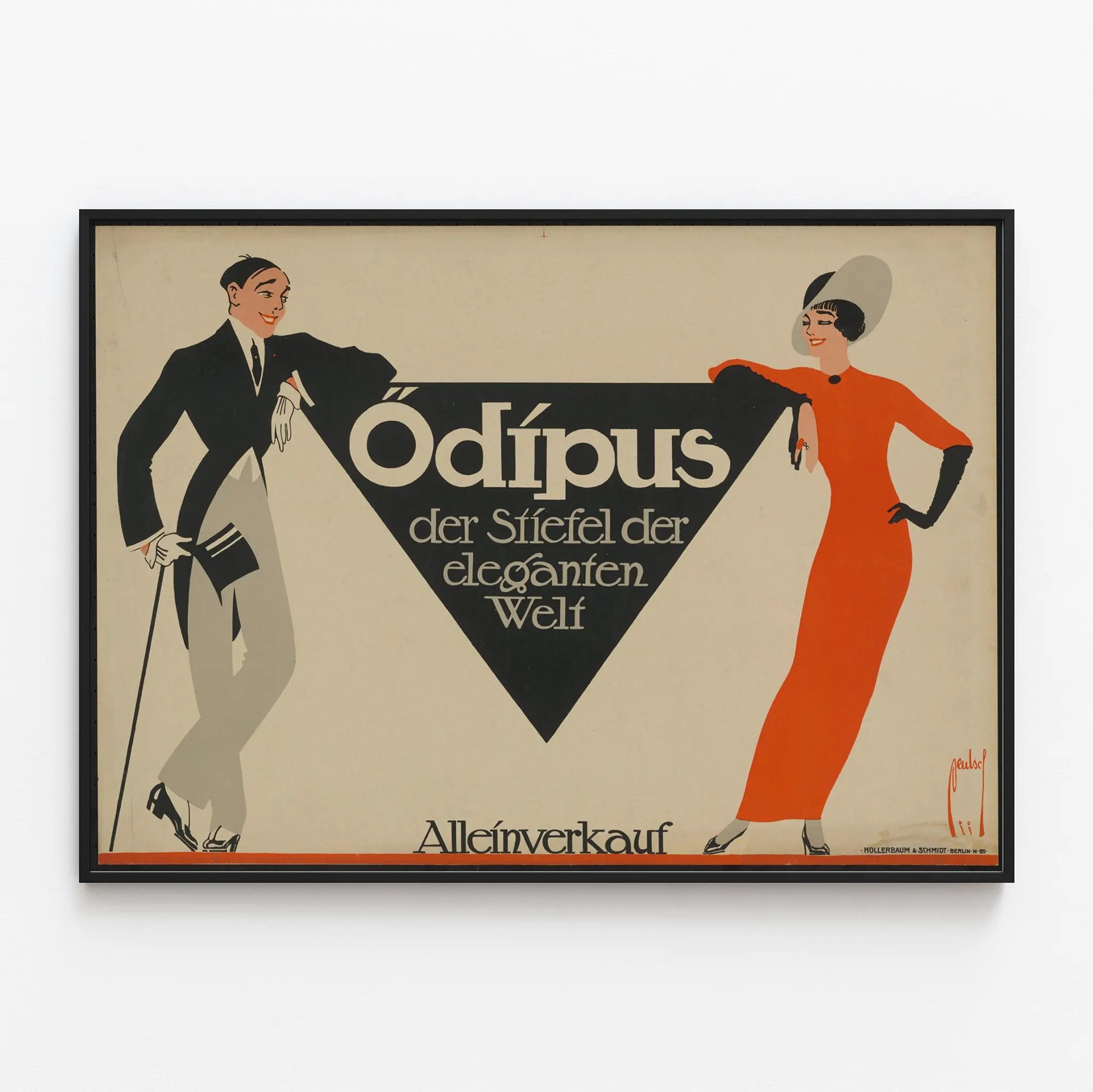 Ta plakat vintage zatytułowany „Oedipus” przedstawia elegancką parę w stylu graficznym retro, charakterystycznym dla sztuki art déco. Postacie są ubrane z dużym wyrafinowaniem: mężczyzna nosi czarny garnitur z białymi rękawiczkami i melonem, podczas gdy kobieta nosi długą, jaskrawoczerwoną suknię uzupełnioną czarnymi rękawiczkami i szerokim kapeluszem, podkreślającym wyrafinowanie. Stylizowane sylwetki otaczają czarny trójkąt na środku plakatu, na którym znajduje się tekst w języku niemieckim „Ódípus der Stiefel der eleganten Welt”, co tworzy silny kontrast wizualny i natychmiast przyciąga uwagę do głównego przekazu.