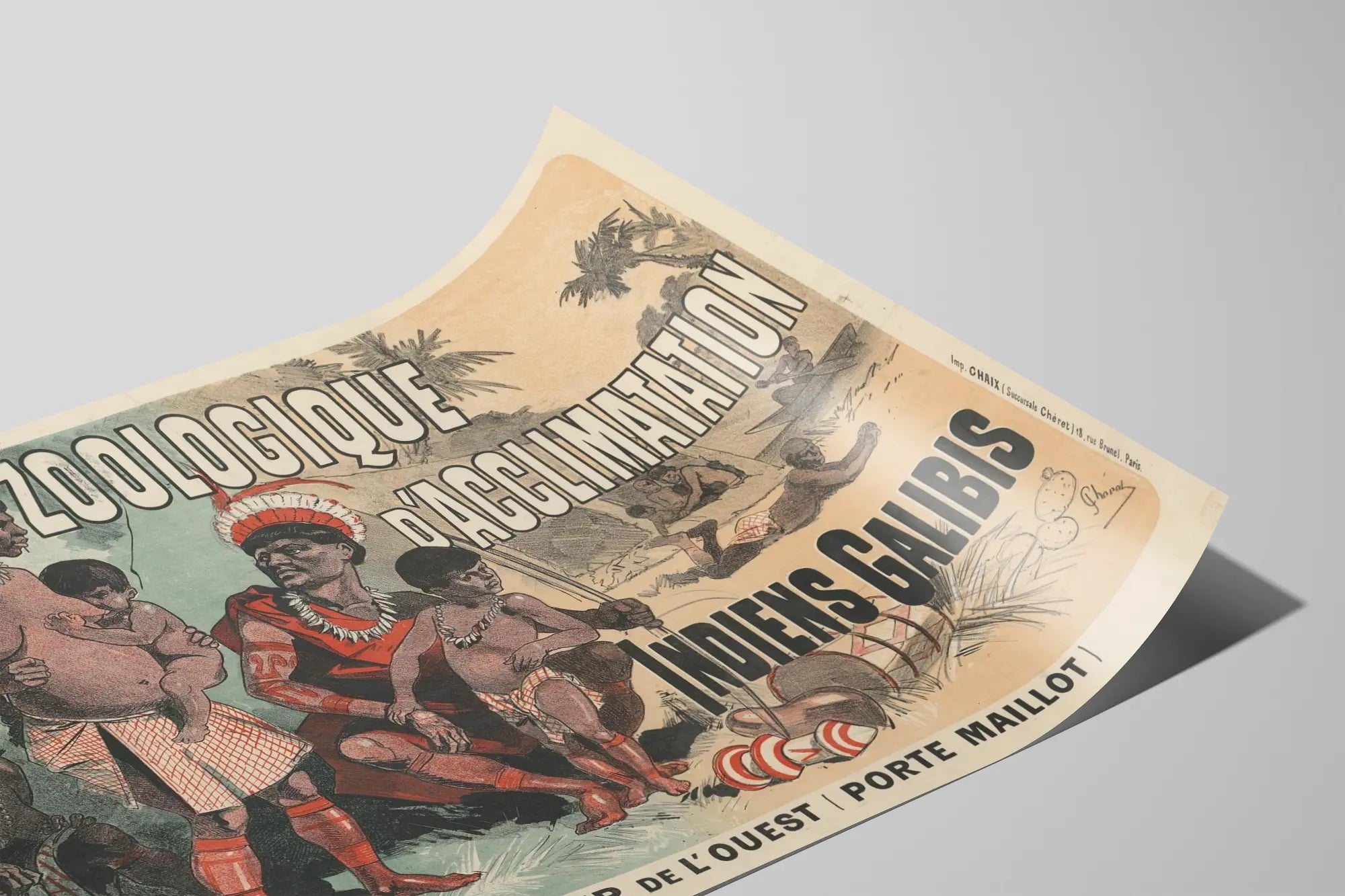 Ta vintage plakat przedstawia scenę z Ogrodu Zoologicznego w Aklimatyzacji, ukazującą Indian Galibis, z typowym graficznym układem charakterystycznym dla starych plakatów. Doskonały do dekoracji ścian, ten poster przypomina estetykę dawnych reklam parków zoologicznych i wystaw etnicznych. Postacie przedstawione w tradycyjnych strojach są narysowane stonowanymi, ciepłymi kolorami, które dodają retro uroku tej dekoracji ściennej. Ten vintage obraz łączy w sobie zarówno historyczną pamiątkę, jak i egzotyczną atmosferę, idealnie wpisując się w wystrój w stylu retro lub etnicznym. W formacie plakatu lub oprawionego obrazu, ta grafika jest idealna do wzbogacenia ściany o odrobinę autentyczności i oryginalności, przywołując miejsce kulturowe i turystyczne, a jednocześnie stanowiąc wyróżniający się element dekoracji ściennej z dawnych czasów. Jego mocny design graficzny i duże litery podkreślają znaczenie i prestiż tego wydarzenia nadanego przez Towarzystwo Kolei Zachodnich. Ta dekoracja ścienna to zaproszenie do podróży, ukazane przez wizualną reprezentację, która jednocześnie oddaje egzotykę i historyczny kontekst epoki.