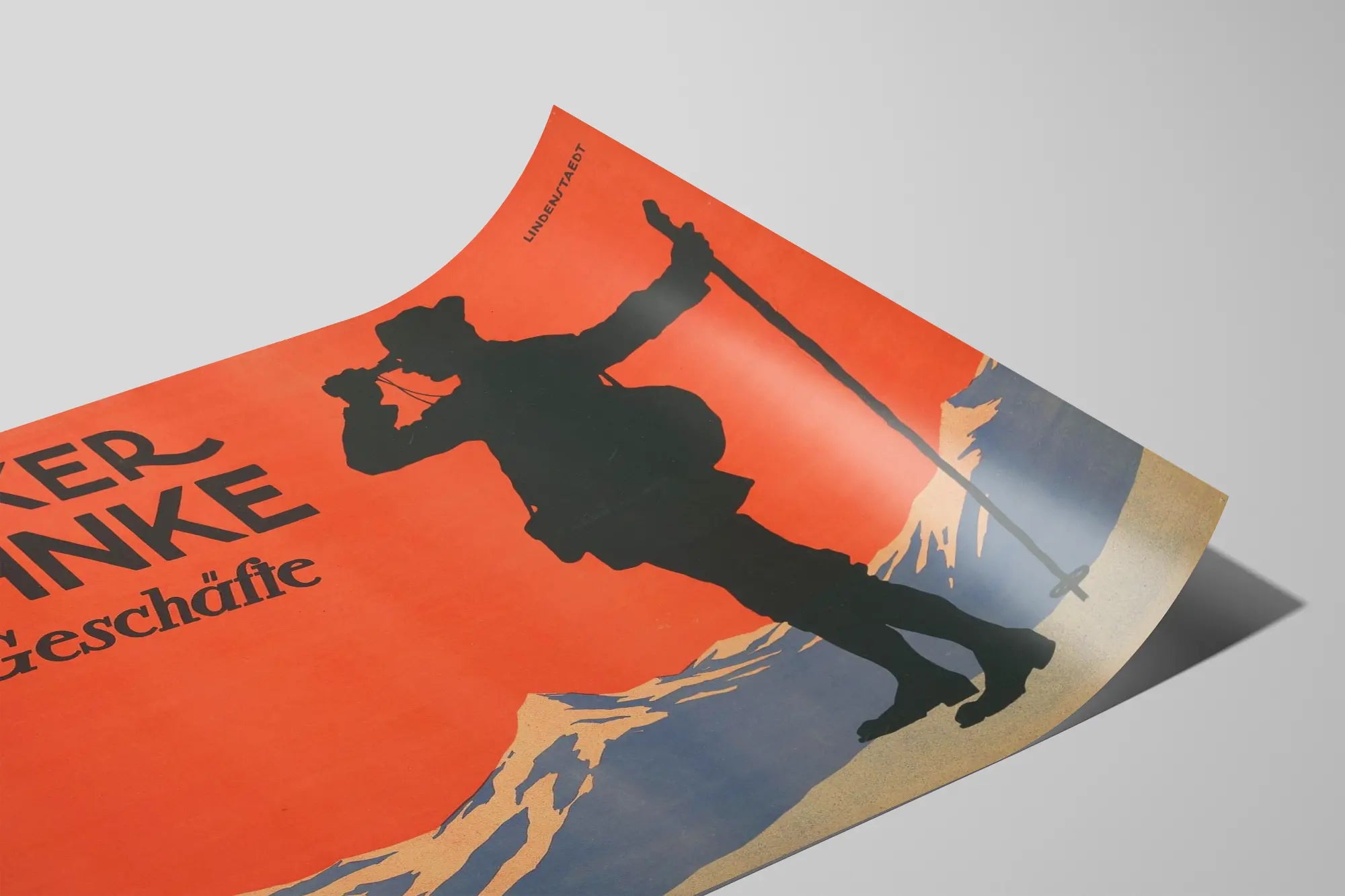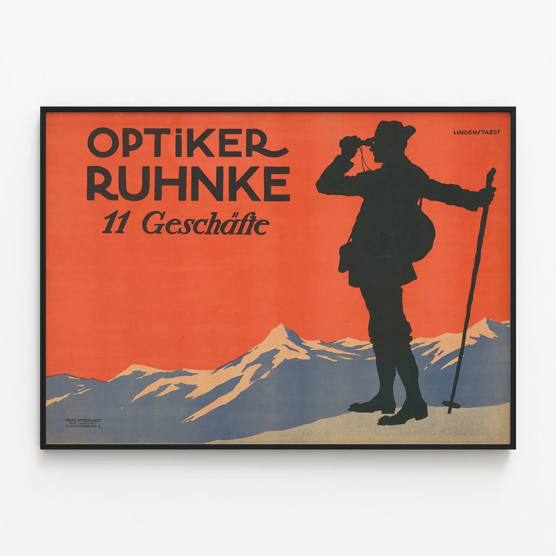 Ta vintage plakat Optiker Ruhnke oferuje unikalną dekorację ścienną w stylu retro i eleganckim. Na tle jaskrawego pomarańczowego koloru, czarna sylwetka wędrowca wyposażonego w lornetki, kapelusz, kij trekkingowy i plecak wyraźnie się wyróżnia. Postać balansuje na szczycie, a w tle znajduje się stylizowany łańcuch górski w odcieniach niebieskiego i beżu. Ta prosta, lecz potężna kompozycja graficzna łączy kontrastowe palety barw, które przyciągają wzrok i tworzą atmosferę przygody i kontemplacji. Napisy "Optiker Ruhnke 11 Geschäfte" zajmują lewy górny róg, wprowadzając interesującą równowagę wizualną całości. Podpisana "Lindenstaedt" i wspominająca "Reklamekunst Hans Lindenstaedt Charlottenburg", ta reklama wpisuje się w tradycję niemieckiego designu graficznego początku XX wieku, gdzie typografia i obraz łączą się, tworząc jasny i zapadający w pamięć przekaz. Ta plakat jest idealny jako dekoracja ścienna dla miłośników vintage, sztuki graficznej lub motywów związanych z optyką i naturą. Wywieszona w salonie, biurze lub tematycznym sklepie, dodaje charakteru, jednocześnie wywołując ducha eksploracji i precyzji wizualnej. Jako plakat ścienny, łatwo wpisuje się w różne style wnętrz, czy to w nowoczesnym otoczeniu dla silnego kontrastu, czy w bardziej klasycznej i eklektycznej aranżacji. Oryginalny wybór dla tych, którzy lubią łączyć historię sztuki z funkcjonalną dekoracją ścienną.