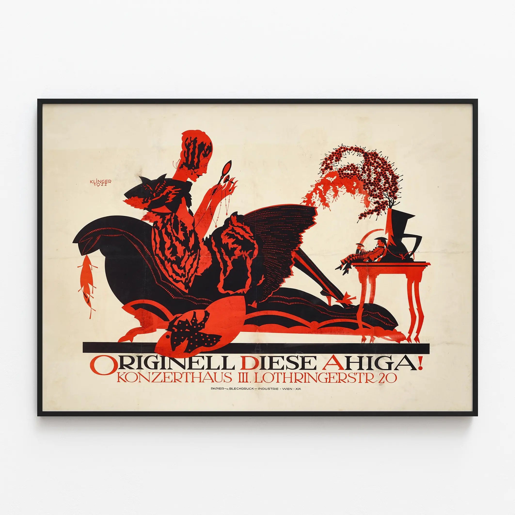 Ta plakat vintage zatytułowany „Originell Diese Ahiga” jest podpisany przez Klingera i pochodzi z 1922 roku. Przedstawia wyraźny styl graficzny, charakteryzujący się użyciem sylwetek w czerni i czerwieni, co nadaje tej dekoracji ściennej zarówno nowoczesny, jak i intrygujący charakter. W centrum obrazu znajduje się postać kobieca w pozycji siedzącej, ubrana w stylizowane formy geometryczne, wydaje się być manipulowana przez małe lustro, co dodaje całości nutę tajemniczości i refleksji estetycznej. Po prawej stronie, ozdobny wazon z jagodami oraz miniaturowa sylwetka mężczyzny leżącego na stole dopełniają kompozycję, ukazując subtelną równowagę między elementami ludzkimi a dekoracyjnymi. Ta stara plakat jest idealna dla miłośników dekoracji ściennych, którzy chcą wprowadzić odrobinę oryginalności i graficznego artystycznego wyrazu do swojego wnętrza. Dobór kolorów czarnego i czerwonego tworzy uderzający kontrast, który przyciąga wzrok i ożywia przestrzeń na ścianie. Wkomponowując ten plakat w salon, biuro lub galerię, podkreślasz nie tylko styl art déco, ale także czystą i mocną grafikę. Napisy wskazujące lokalizację „Konzerthaus III. Lothringerstr 20” dodają temu dziełu wymiar historyczny i lokalny, czyniąc ten plakat interesującym zarówno dla kolekcjonerów, jak i pasjonatów autentycznych dekoracji ściennych. Ta grafika wyróżnia się zdolnością do łączenia abstrakcji z figuratywnością przy dużej oszczędności środków, co czyni ją wszechstronnym i ponadczasowym elementem dekoracyjnym. Doskonała do nowoczesnych lub retro wnętrz, ta dekoracyjna plakat pozwala wprowadzić oryginalną atmosferę artystyczną, zachowując minimalistyczną i geometryczną estetykę. Niezależnie od tego, czy jest to kolekcja prywatna, czy sposób na podniesienie walorów dekoracji ściennej przestrzeni życiowej, ten vintage’owy plakat jest wyrazistym elementem przyciągającym wzrok i zachęcającym do kontemplacji. Preferując równowagę między formami a kolorami, łatwo wpisuje się w różne style aranżacji wnętrz, dodając charakteru i osobowości Twojej dekoracji.