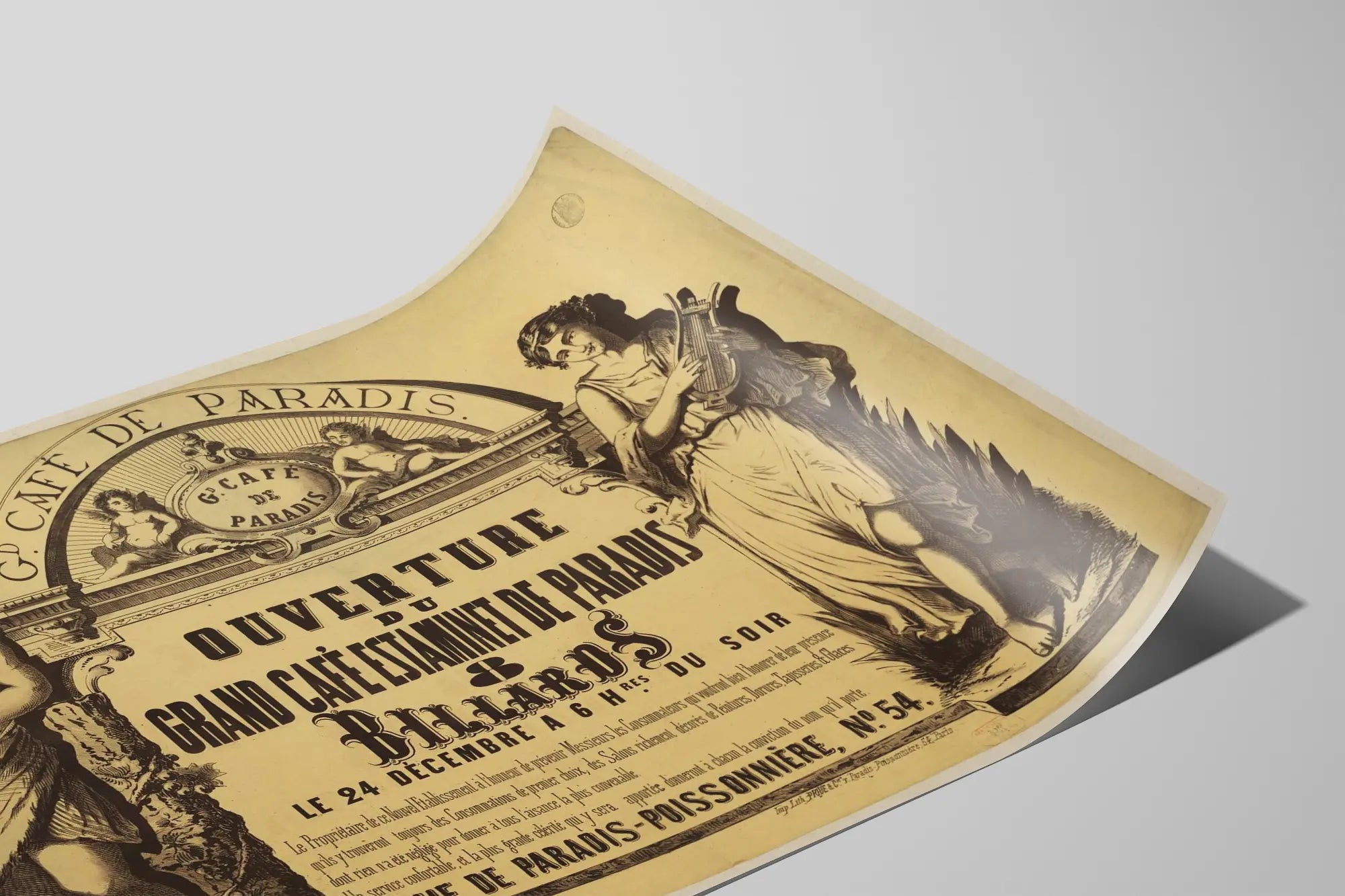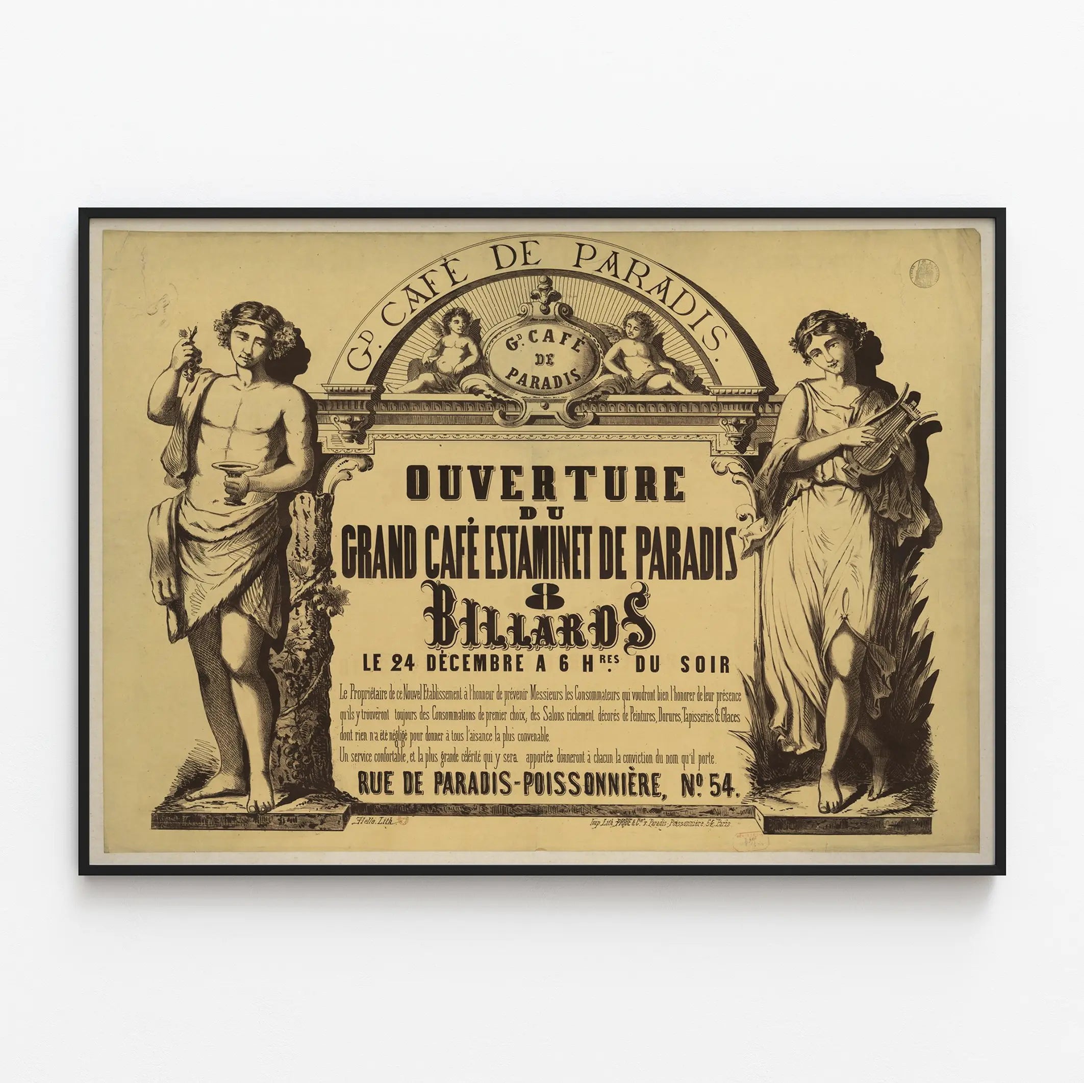 Ta vintage plakat, elegancka i wyrafinowana, zapowiada otwarcie Wielkiej Kawiarni Estaminet de Paradis, ikonicznego miejsca usytuowanego przy ulicy Paradis-Poissonnière, nr 54. Zaprojektowana w klasycznym stylu z wpływami neoklasycznymi, ta dekoracja ścienna przedstawia dwóch postaci odzianych w płaszcze, trzymających odpowiednio kieliszek i harfę, symbolizując gościnność i przyjazną atmosferę kawiarni oraz sztukę i kulturę. Prosta i harmonijna typografia podkreśla oficjalne otwarcie planowane na 24 grudnia o godzinie 18:00, a także obecność bilarda, przyciągając miłośników rozrywek i relaksu.