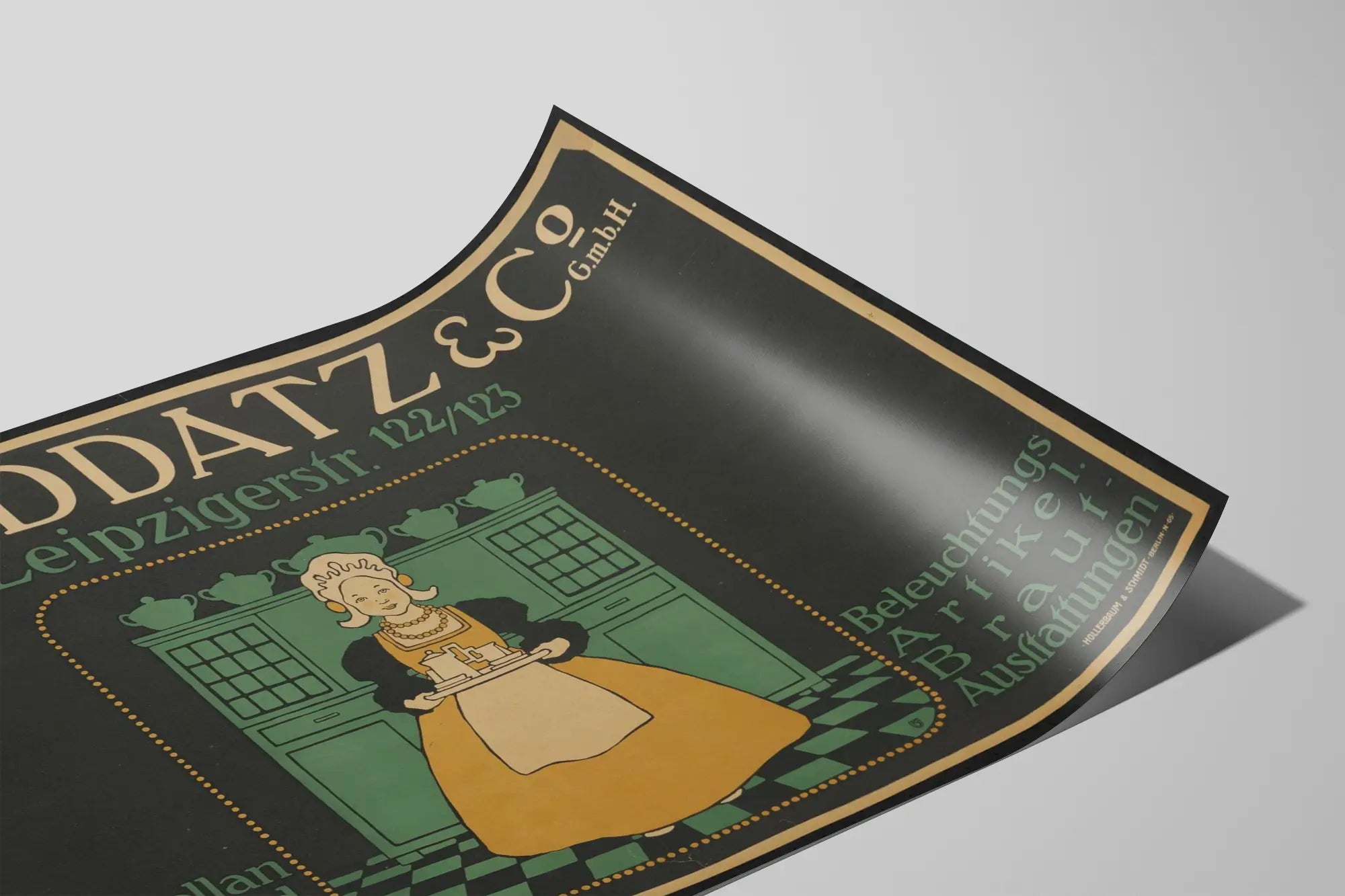 Odkryj tę plakat vintage reklamowy dla P. Raddatz & Co GmbH, elegancką dekorację ścienną idealną do dodania retro i autentycznego charakteru Twojemu wnętrzu. Plakat przedstawia stylizowaną ilustrację kobiety w tradycyjnym stroju, trzymającej tacę z serwisem do herbaty, na tle starego bufetu, przywołując kulinarne czasy minione. Główne kolory użyte to zieleń, ochra i czerń, które nadają temu plakatowi subtelny i klasyczny urok. Doskonały jako dekoracja ścienna w kuchni lub jadalni, ten vintage'owy plakat przypomina sztukę nakrywania do stołu, z odniesieniami do produktów takich jak szkło, porcelana, urządzenia kuchenne, a także elementy oświetlenia i dekoracji ślubnych. Jego graficzny i typograficzny styl z początku XX wieku czyni go unikalnym elementem dekoracyjnym, który z elegancją podkreśli Twoje ściany. Plakat jest oprawiony w prostą ramę, która eksponuje centralny motyw, wzmacniając ciepłą i przyjazną atmosferę charakterystyczną dla tradycyjnego domu. Idealny dla miłośników vintage'owej dekoracji ściennej, kolekcjonerów starych plakatów, a także tych, którzy chcą spersonalizować przestrzeń odrobiną historii i autentyczności. Jego klasyczny design łatwo wpisuje się w różne style wnętrz, od rustykalnych po nowoczesne, tworząc oryginalny kontrast. Ten reklamowy plakat to znacznie więcej niż zwykły obraz – opowiada historię rzemiosła i troski o codzienne przedmioty. Wysoka jakość druku gwarantuje trwałe kolory, które będą ozdabiać Twoją ścianę przez wiele lat. Postaw na ten oryginalny obraz ścienny, aby dodać nutę nostalgii i wyrafinowania do swojej dekoracji, podkreślając nieodzowny motyw kulinarny i domowy. Ta grafika odzwierciedla estetykę typograficzną i malarską epoki, którą z gustem warto włączyć do swojej kolekcji dekoracyjnych plakatów.