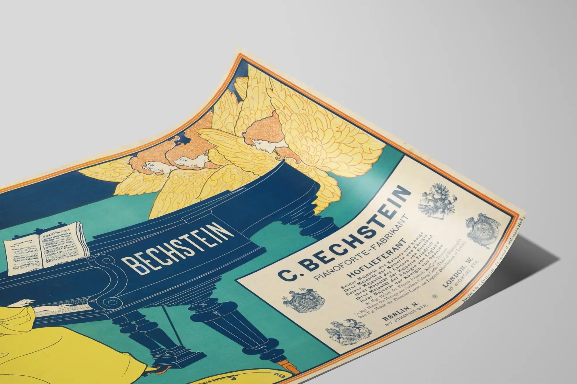 Ta vintage plakat przedstawia elegancką i artystyczną scenę skoncentrowaną wokół fortepianu marki "Bechstein". Kompozycja ukazuje kobietę w żółtej sukni siedzącą przy fortepianie i grającą muzykę, podczas gdy trzy skrzydlate postacie z czerwonymi włosami wydają się śpiewać lub towarzyszyć melodii. Dominujące kolory, niebieski, żółty i pomarańczowy, tworzą harmonijny i ciepły kontrast, idealny, aby dodać retro i artystyczny akcent do Twojej dekoracji ściennej. Ta ilustracja podpisana jest przez Lovisa Rheada, co dodaje plakatowi artystycznego i autentycznego wymiaru.