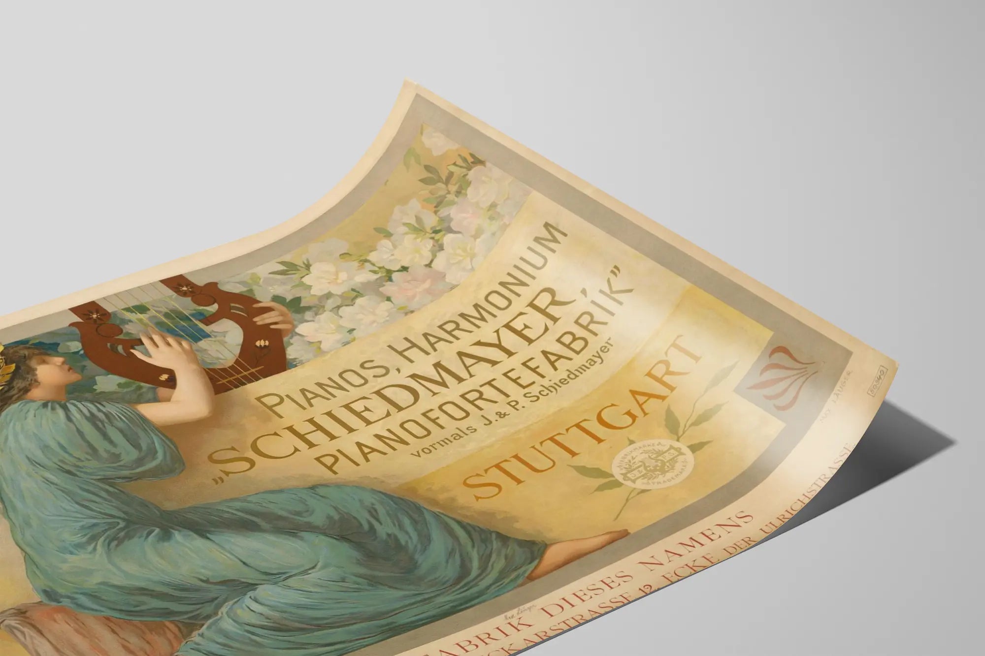 Dodaj do swojego wnętrza odrobinę klasycznej elegancji dzięki tej vintage plakatowi przedstawiającemu reklamę pianin i harmonii Schiedmayer, słynnej fabryki pianoforte z siedzibą w Stuttgarcie. Ta dekoracja ścienna subtelnie ukazuje młodą kobietę z długimi włosami, ubraną w zwiewną, jasnoniebieską suknię, grającą na ozdobionej drewnianej liry, w stylu artystycznym dawnym i wyrafinowanym.