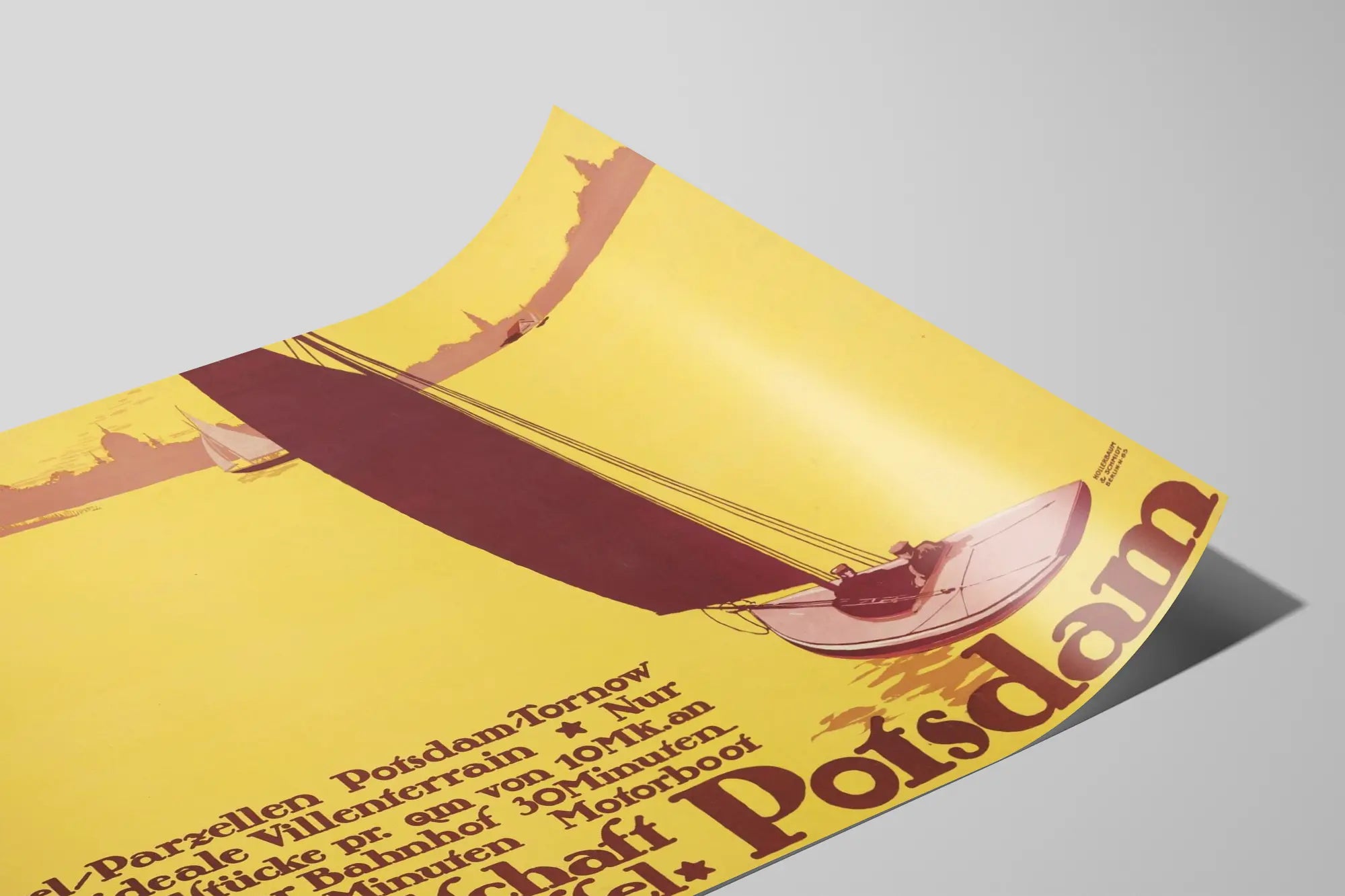 Ta vintage plakat przedstawia elegancką scenę morską na pierwszym planie z stylizowanym żaglowcem żeglującym po wodzie o odcieniach żółci i brązu. W tle subtelnie wyłania się sylwetka historycznych budynków Poczdamu, tworząc harmonijny kontrast między wodą a miastem. Tekst w języku niemieckim wskazuje, że działki nad wodą w Poczdamie-Tornow są idealne do budowy willi, podkreślając bliskość dworca kolejowego w Poczdamie (30 minut pociągiem) oraz szybki dostęp łodzią motorową (5 minut). Ten plakat doskonale wpisuje się w dekorację ścienną w stylu retro, wprowadzając atmosferę zarówno elegancką, jak i nostalgiczną. Dzięki ciepłym barwom i minimalistycznym kształtom, ta reprodukcja jest idealna do ozdobienia salonu, biura lub przestrzeni życiowej, dodając odrobinę uroku i miejskiej historii. Ten obraz na ścianę skierowany jest do miłośników vintage’owego designu graficznego, klasycznych plakatów oraz motywów związanych z nautyką i urbanistyką. To doskonały wybór dekoracyjny dla tych, którzy pragną połączyć estetykę dawną z relaksującą atmosferą inspirowaną życiem nad wodą.