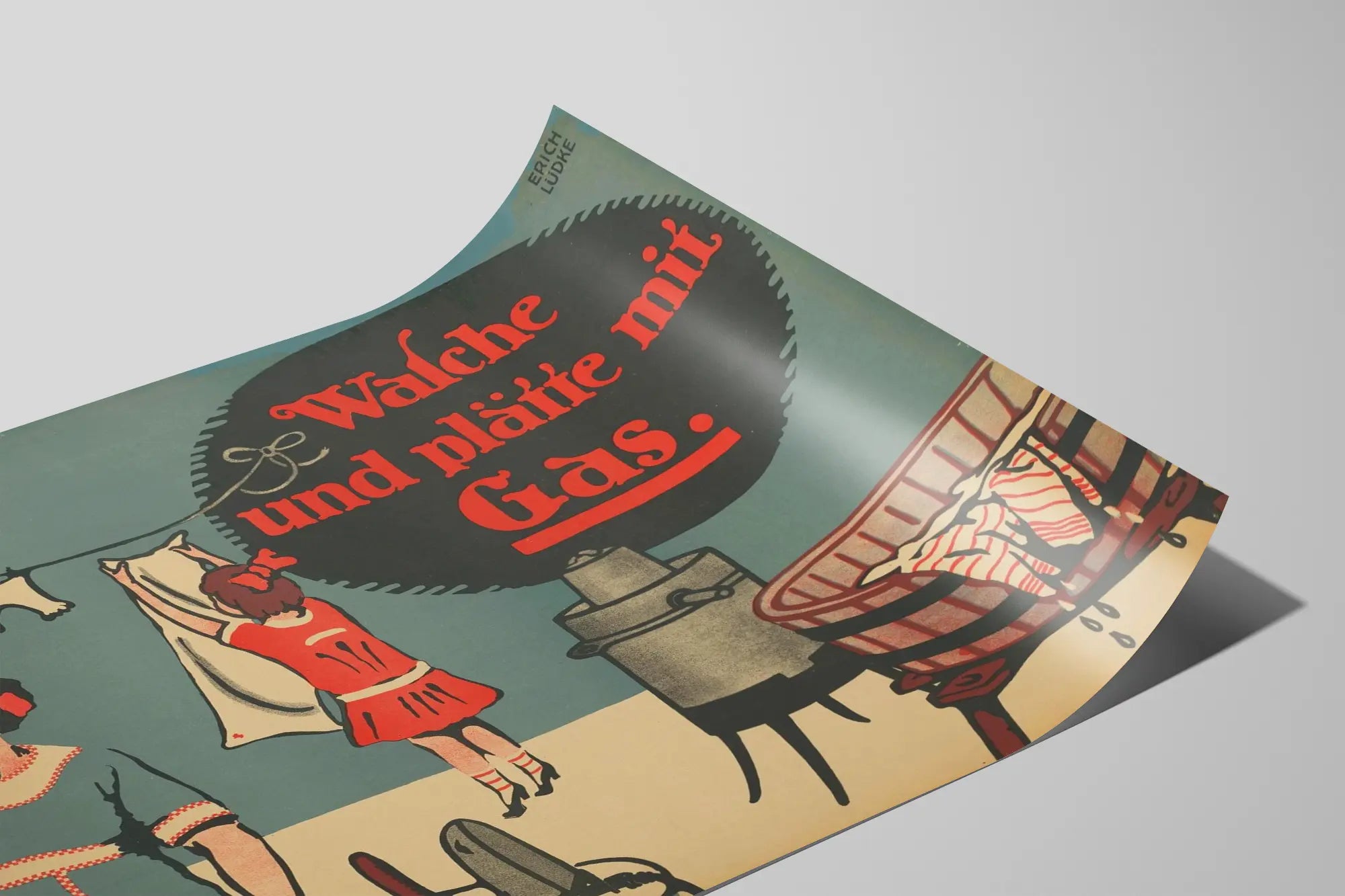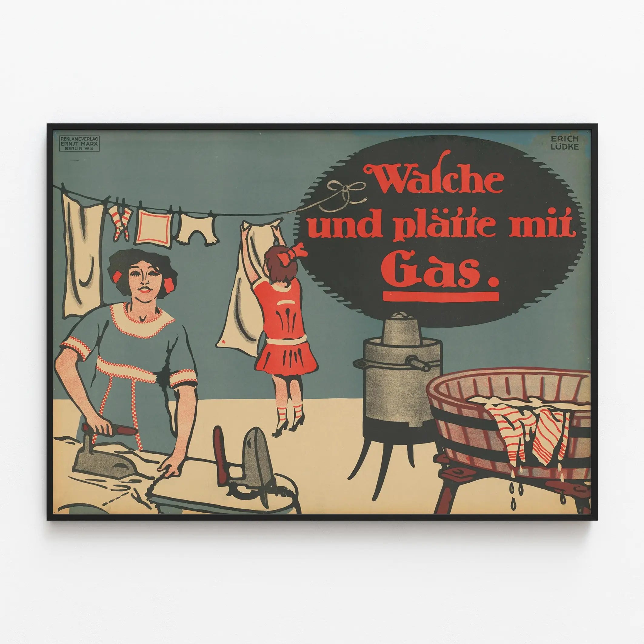 Ta plakat vintage przedstawia scenę codziennego życia skoncentrowaną na praniu i prasowaniu odzieży przy użyciu gazu. Widać kobietę zajęta prasowaniem ubrań starą żelazkiem, podczas gdy mała dziewczynka wiesza pranie na sznurze. Po prawej stronie znajduje się urządzenie do prania na gaz, prawdopodobnie podgrzewające kadź lub basen, dopełniające scenę. Tekst „Pranie i prasowanie przy użyciu gazu” jest zapisany czerwonymi literami w czarnym dymku, podkreślając użycie gazu do tych prac domowych.