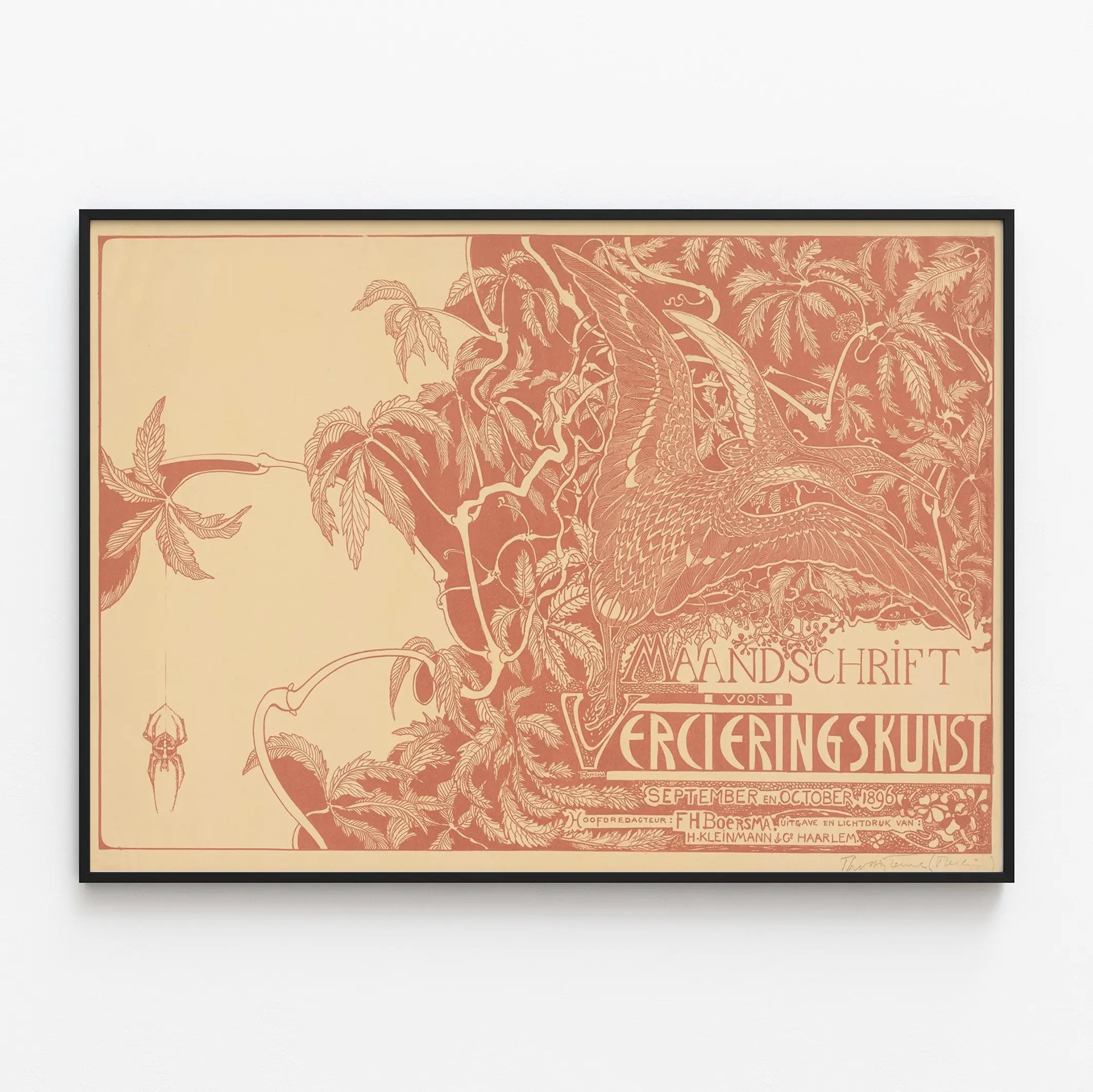 Poznaj tę plakat w stylu secesyjnym, przedstawiający z finezją dwa ptaki w locie pośród stylizowanego listowia. Ta dekoracja ścienna wyróżnia się delikatną grafiką i harmonijną kompozycją, w której kręte gałęzie i szczegółowe liście otaczają oba ptaki, dodając wnętrzu naturalnego i eleganckiego charakteru. Sylwetka pająka wiszącego na swojej sieci dopełnia tę scenę przyrodniczą, podkreślając wyrafinowany efekt wizualny.