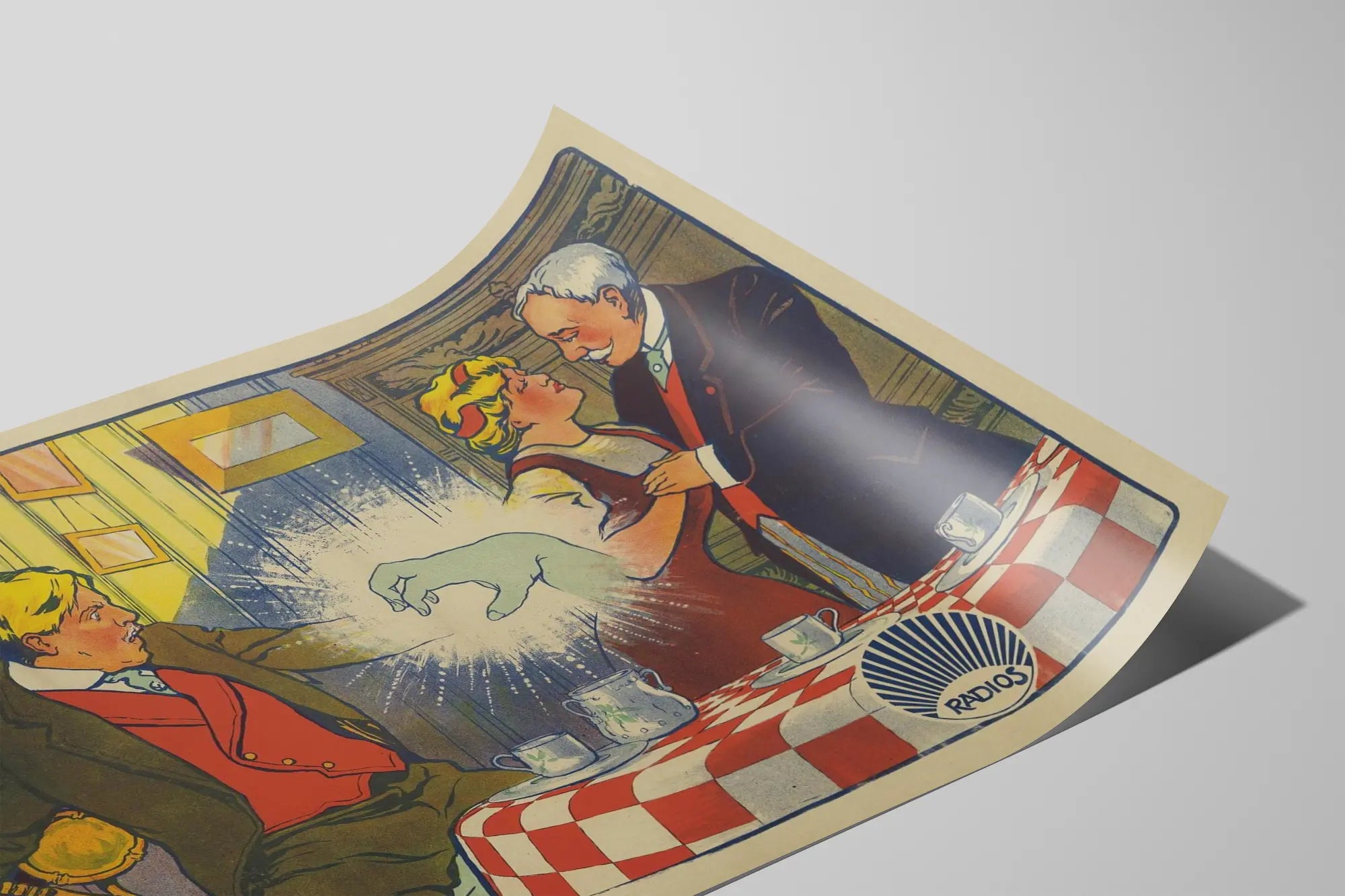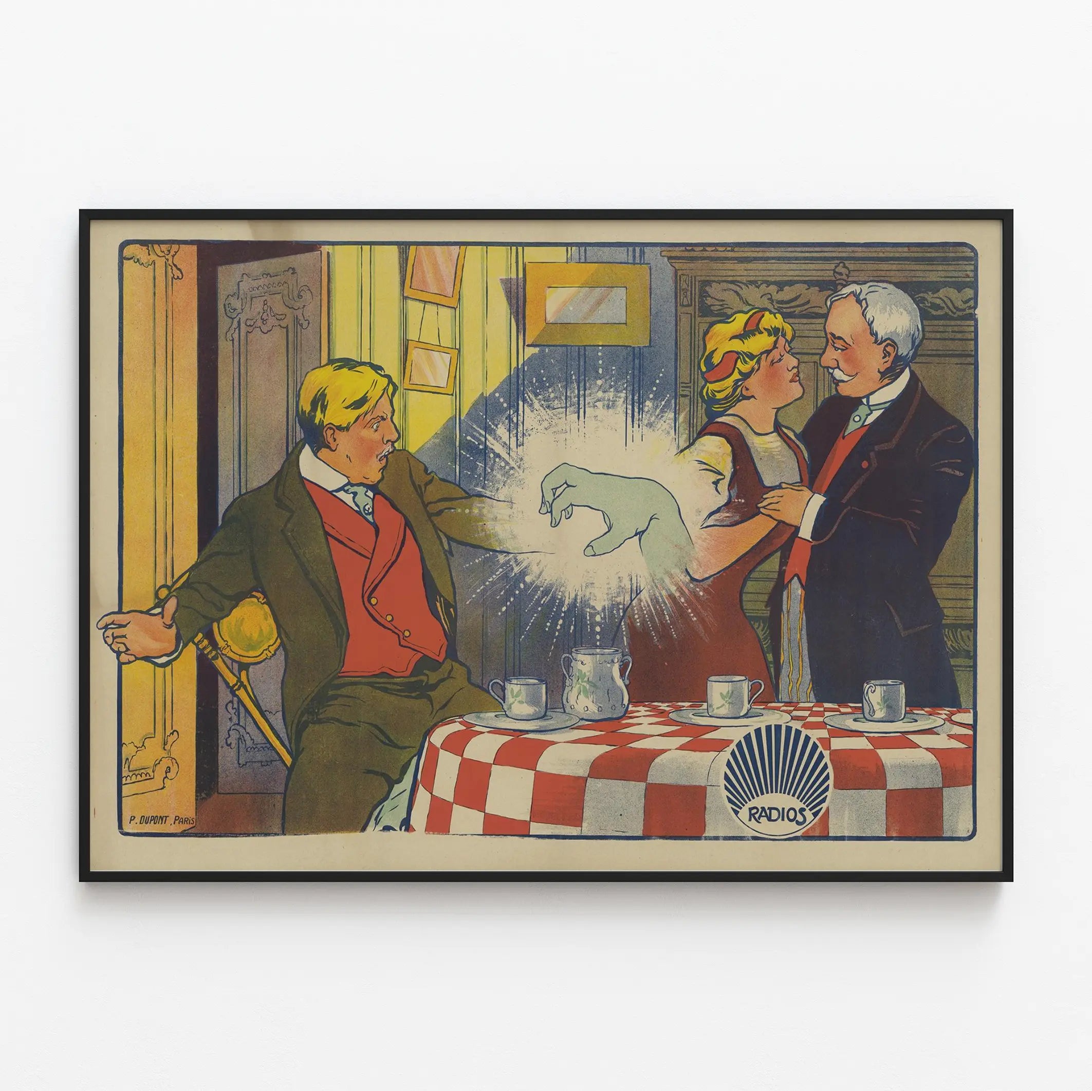 Ta vintage plakat zatytułowany „Zielona Dłoń” to unikalna dekoracja ścienna, która doda Twojemu wnętrzu odrobinę oryginalności i retrouroczego uroku. Stylizowany w dawnym stylu ilustracyjnym, przedstawia świecącą dłoń wyłaniającą się z centrum pomieszczenia, z dynamicznym efektem świetlnym i postaciami wywołującymi wrażenie zaskoczenia i magii. Graficzna stylistyka w ciepłych barwach, łącząca czerwień, żółć, błękit i beż, nadaje tej plakacie atmosferę charakterystyczną dla początków ilustrowanej reklamy radiowej.
