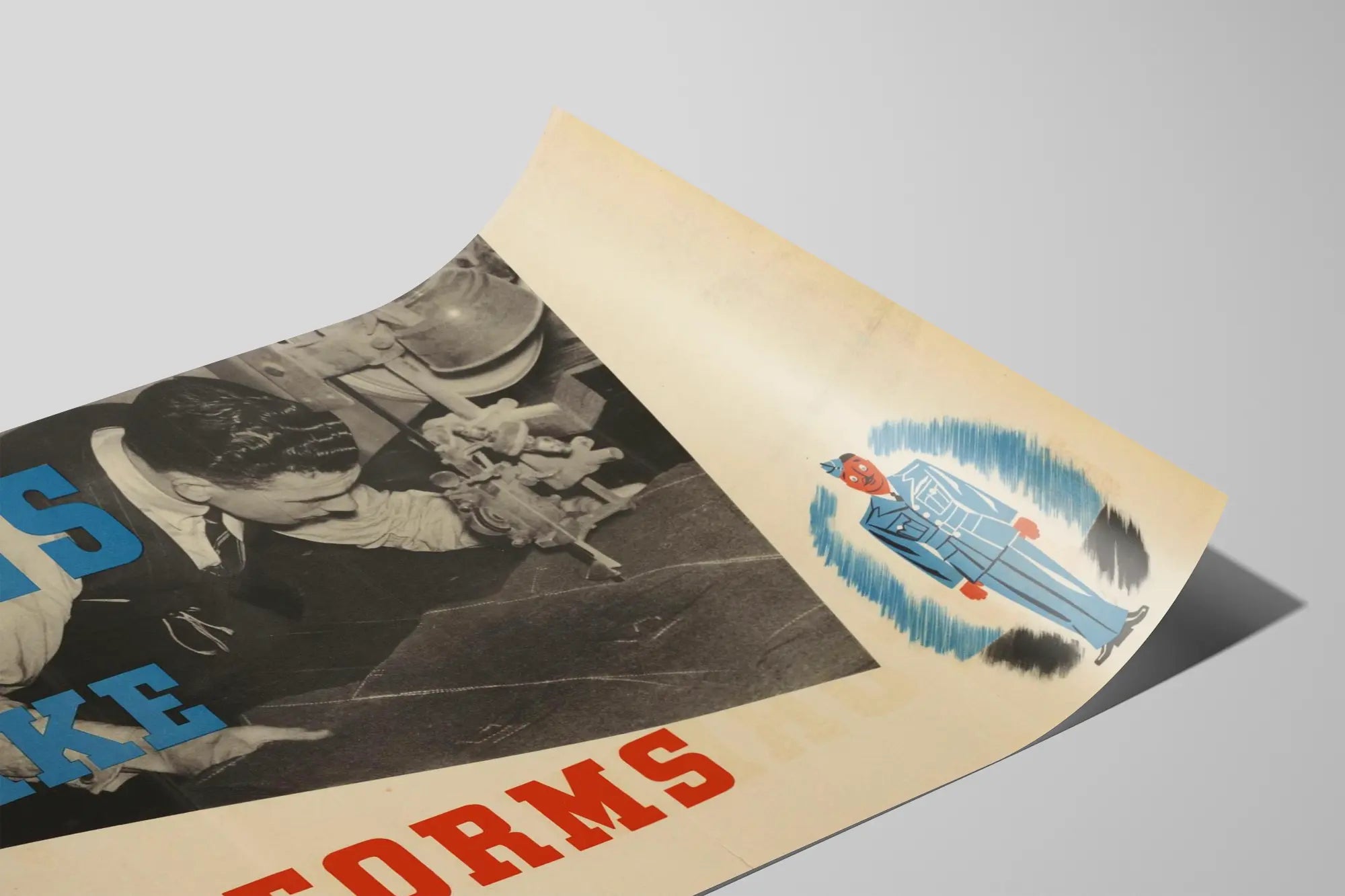 Ta plakat vintage zatytułowany „Rags Make Uniforms” to oryginalny wybór, który doda industrialnego i retro charakteru Twojej dekoracji ściennej. Przedstawia czarno-białe zdjęcie skupionego pracownika przy maszynie do szycia przemysłowej, podczas tworzenia tekstylnych elementów. Słowa „RAGS” i „MAKE” są wydrukowane dużymi niebieskimi literami, podczas gdy „UNIFORMS” pojawia się jaskrawoczerwonym kolorem, podkreślając wizualny efekt tego plakatu. Po prawej stronie stylizowana ilustracja w kolorach ukazuje postać ubraną w niebieski mundur wojskowy, symbolizującą efekt pracy krawca. Ta graficzna kompozycja łączy fotografię z ilustracją, tworząc kontrast między tradycyjną pracą ręczną a symbolicznym obrazem gotowego munduru.