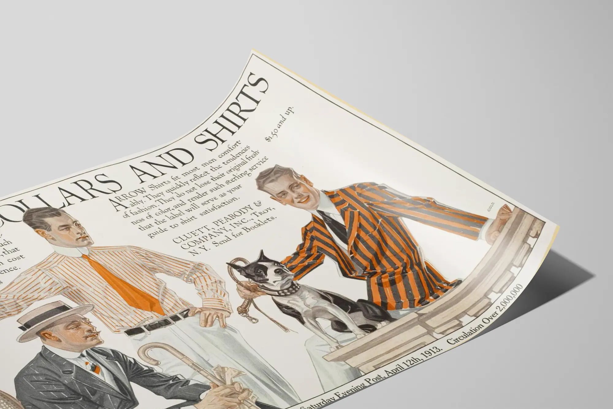 Ta vintage'owa plakat przedstawia reklamę z 1913 roku marki Arrow Collars and Shirts, ikony znanej z eleganckich kołnierzyków i koszul dla mężczyzn. Ten plakat dekoracyjny na ścianę ukazuje trzech mężczyzn w koszulach w paski i dopasowanych garniturach, charakterystycznym stylu początku XX wieku. Humor i urok tej ilustracji podkreśla obecność psa siedzącego na parapecie, symbolu eleganckiej i swobodnej atmosfery.