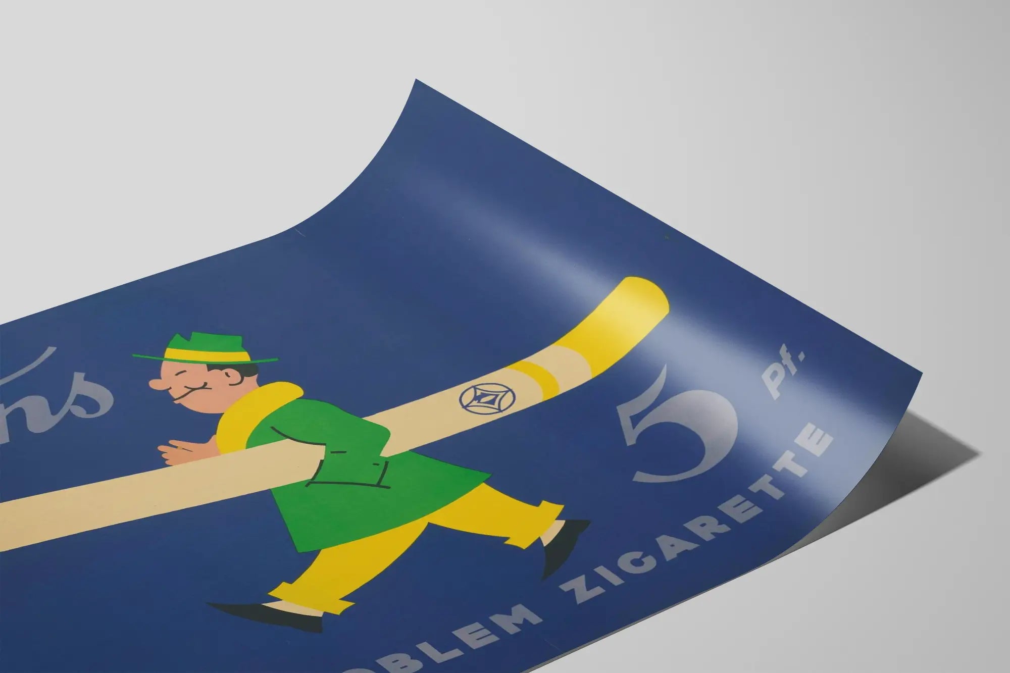 Ta plakatowa reklama z epoki przedstawia stylizowaną postać z dużym papierosem na ramieniu, w minimalistycznym i kolorowym stylu graficznym. Tło w głębokim odcieniu niebieskiego tworzy uderzający kontrast z jaskrawymi barwami postaci ubranej w zielony płaszcz, żółte spodnie i dopasowany kapelusz. Tekst "Trans" i "Die Problem Zigarette" jest wydrukowany jasno, zapewniając wyrazistą, retro wizualną tożsamość. Ilustracja przywołuje atmosferę reklam z minionych lat, idealną do dekoracji ścian, która wnosi nutę przemysłowej nostalgii i rozpoznawalnej estetyki vintage. Doskonała jako plakat, ta dekoracja ścienna z wdziękiem wkomponuje się w nowoczesne lub klasyczne wnętrze, nadając przestrzeni unikalny i autentyczny akcent. Ta ściana obrazowa skierowana jest do miłośników designu retro, starych plakatów reklamowych i prostego, lecz wyrazistego grafizmu. Łącząc wyraziste kolory i zrównoważoną kompozycję, ta plakat staje się centralnym elementem Twojej aranżacji wnętrza. Szczególnie sprawdzi się w pomieszczeniach dziennych, biurach, restauracjach lub przestrzeniach poświęconych kulturze vintage i stylowi przemysłowemu. Wybierz ten dekoracyjny plakat, aby wyczarować atmosferę pełną charakteru i przywołać historię reklamy związanej ze światem tytoniu. Ten produkt to świetny pomysł na prezent dla pasjonatów grafiki retro i oryginalnej dekoracji ścian, oferując dekorację, która przyciąga wzrok i zachęca do autentycznego klimatu.