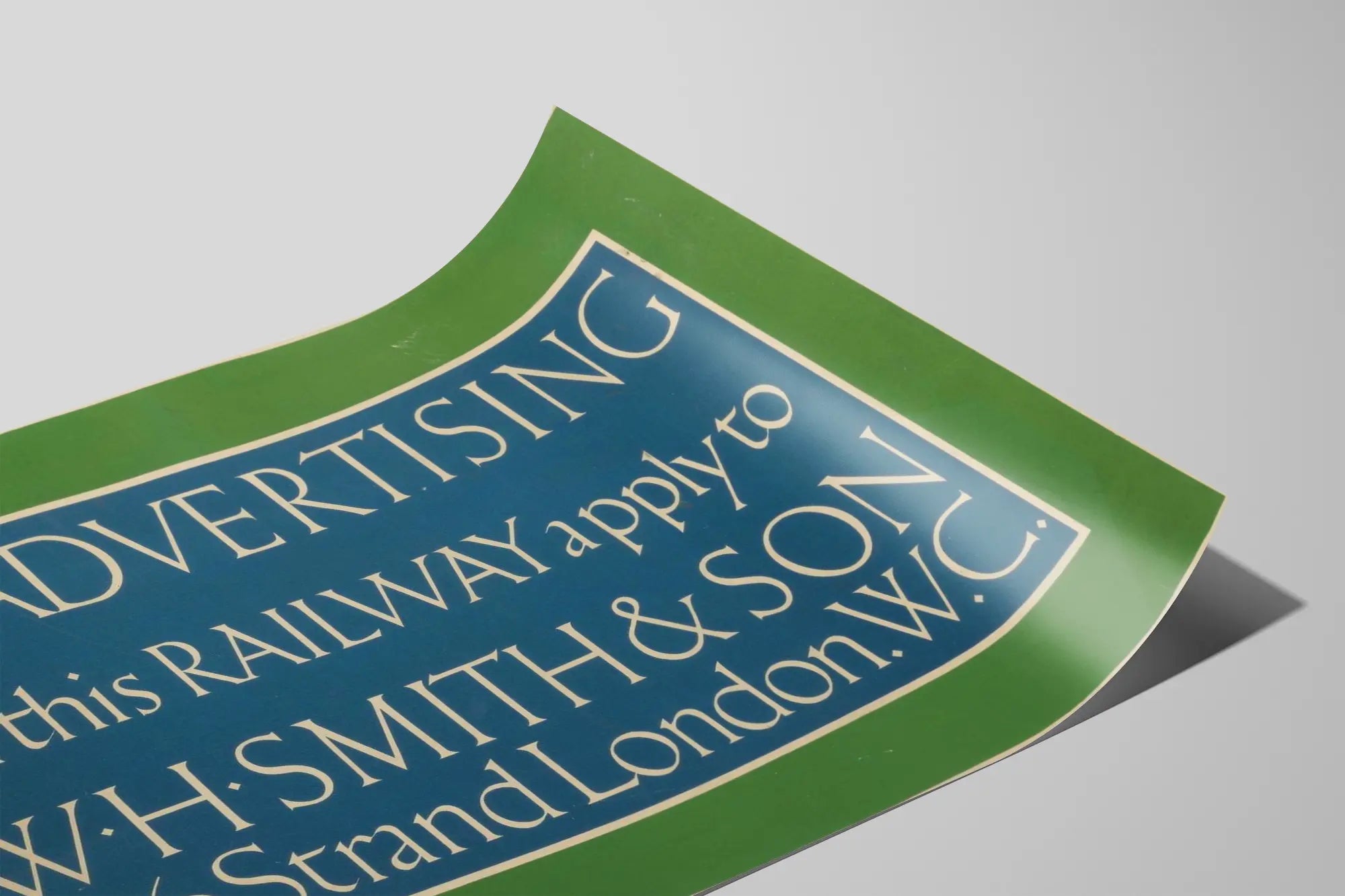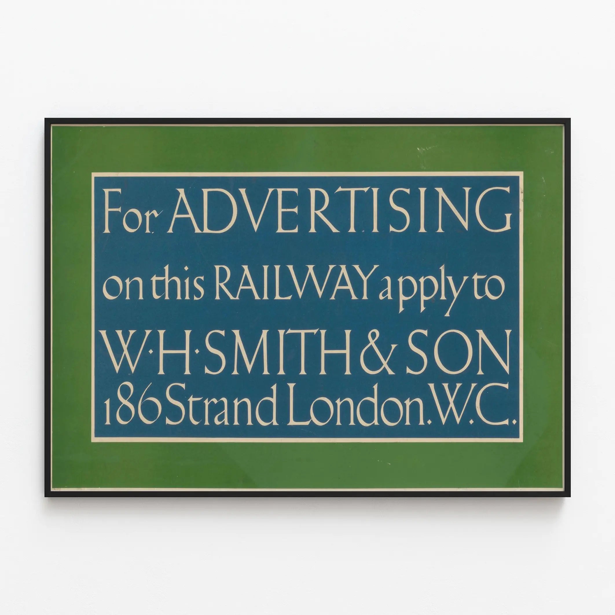 Poznaj tę oryginalną, vintage plakat przeznaczony do reklamy kolejowej, będący uderzającym przykładem dekoracji ściennej o historycznym charakterze. Ten plakat wyróżnia się elegancką i starannie wykonaną typografią na dwukolorowym tle w odcieniach zieleni i niebieskiego, idealnym do dodania retro klimatu do Twojego wnętrza. Napisy zachęcają do składania zapytań reklamowych do W.H. Smith & Son, z dokładnym adresem podanym jako 186 Strand, Londyn W.C., podkreślając znaczenie komunikacji handlowej na kolei w minionych czasach. Ten plakat doskonale wpisuje się w kolekcję starych plakatów lub tematyczną dekorację ścienną, niezależnie od tego, czy jest poświęcony transportowi, reklamie czy historii. Jego prosty i bezpośredni styl, z bardzo czytelnym układem, czyni go elementem dekoracyjnym, który potrafi przyciągnąć wzrok, jednocześnie dodając unikalnej autentyczności. Idealny dla miłośników starego designu graficznego lub do wzbogacenia vintage'owej atmosfery, ten plakat wyróżnia się wyraźnym wyeksponowaniem tekstu i zieloną ramą, która otacza głęboki niebieski panel, tworząc harmonijny kontrast wizualny. Wyeksponuj ten plakat w salonie, biurze lub przestrzeni handlowej, aby stworzyć atmosferę z charakterem, przywołującą urok dawnych reklam kolejowych.