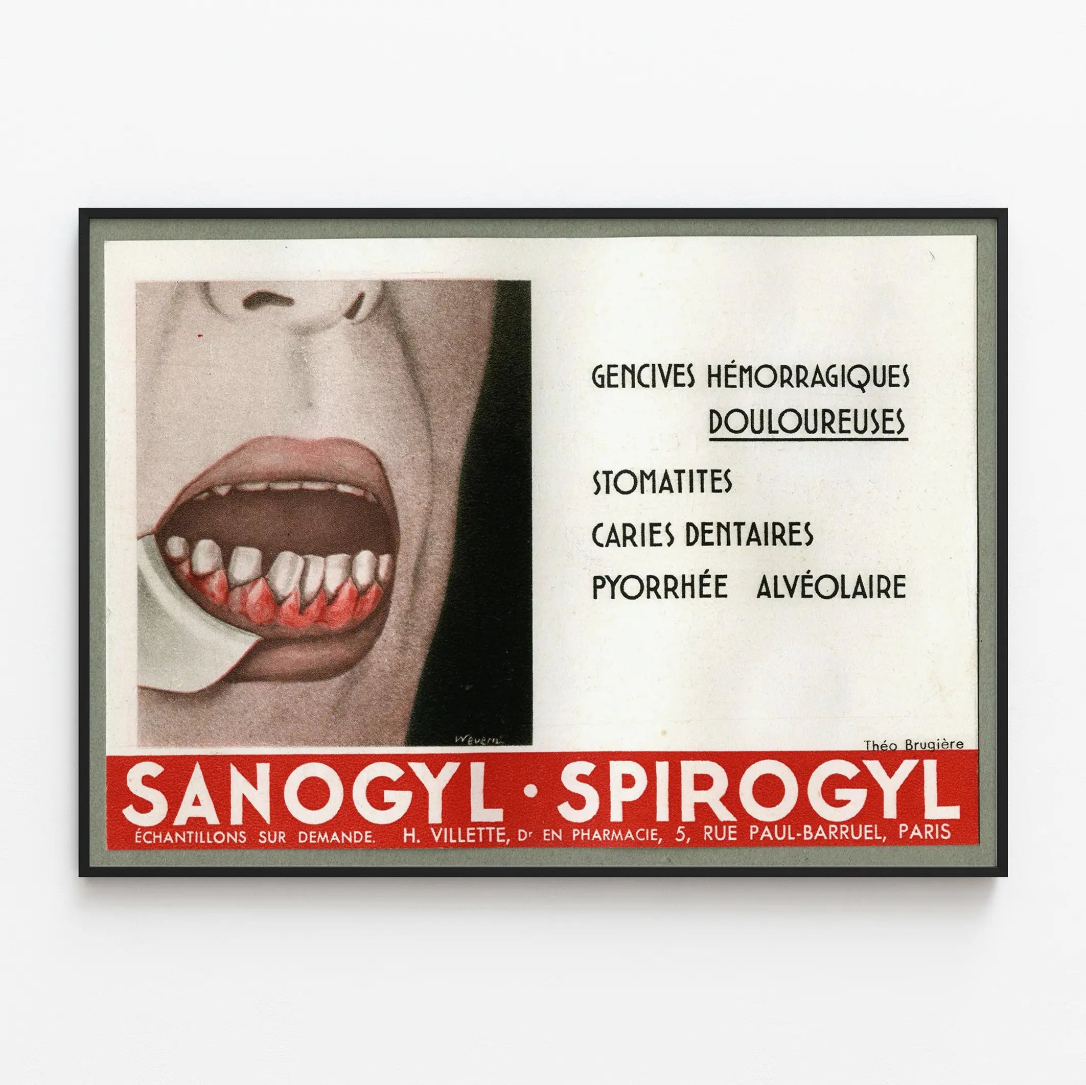 Ta vintage plakat reklamowy Sanogyl Spirogyl to unikalny element dla miłośników oryginalnej i historycznej dekoracji ściennej. Podkreśla powszechne problemy stomatologiczne, takie jak bolesne krwawiące dziąsła, stomatity, próchnicę zębów oraz ropnie zębodołowe, ilustrowane szczegółowym rysunkiem przedstawiającym otwartą buzię z zapalonymi, czerwonymi dziąsłami. Ten stary plakat, podpisany przez Théo Brugière i wydany przez H. Villette, doktora farmacji, jest zarówno dziełem sztuki, jak i świadectwem przeszłości w dziedzinie zdrowia jamy ustnej. Jego graficzny styl z minionych lat dodaje retro charakteru każdemu wnętrzu, czy to w poczekalni lekarskiej, gabinecie stomatologicznym, czy w osobistej kolekcji tematycznych dekoracji ściennych. Staranna typografia i kontrast między jaskrawą czerwienią reklamy a jasnym tłem wzmacniają wizualny efekt tego wydrukowanego obrazu. Ten klasyczny format plakatu jest idealny dla tych, którzy poszukują dekoracji ściennej zarówno informacyjnej, jak i estetycznej, łączącej sztukę graficzną z tematem medycznym. Włączenie tego plakatu do wnętrza pozwala stworzyć vintage'ową atmosferę, podkreślając historię profilaktyki stomatologicznej. Niezależnie od tego, czy jest to element w korytarzu, główny punkt w biurze, czy dodatek do galerii ściennej, ta dekoracja przyciągnie uwagę dzięki wyrazistemu przekazowi i sugestywnej ilustracji. Ten plakat reklamowy to wyjątkowy pomysł na dekorację dla pasjonatów historii farmacji, vintage lub grafiki medycznej. Doskonale łączy funkcjonalność z urodą dekoracyjną, dodając autentycznego charakteru, który przypadnie do gustu wszystkim miłośnikom oryginalnych plakatów. Odkryj, jak stare ogłoszenie może przemienić się w piękny, współczesny element dekoracji ściennej.