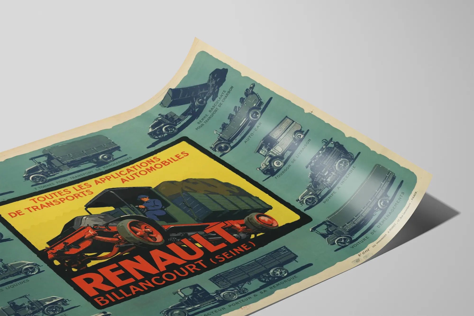 Na środku, czerwony samochód ciężarowy dominujący na żółtym tle przyciąga natychmiast uwagę, z napisem „wszystkie zastosowania transportu samochodowego” oraz podpisem „Renault Billancourt (Sekwana)”. Wokół, kilka ilustracji przedstawia wyspecjalizowane pojazdy: ciężarówkę do przewozu win, platformy na 5 do 7 ton, wywrotkę do węgla, opryskiwacz-zamiatacz, transport cieczy, autokary, furgony dostawcze, wąż strażacki, pojazdy do przeprowadzek oraz ciągniki z przyczepami.