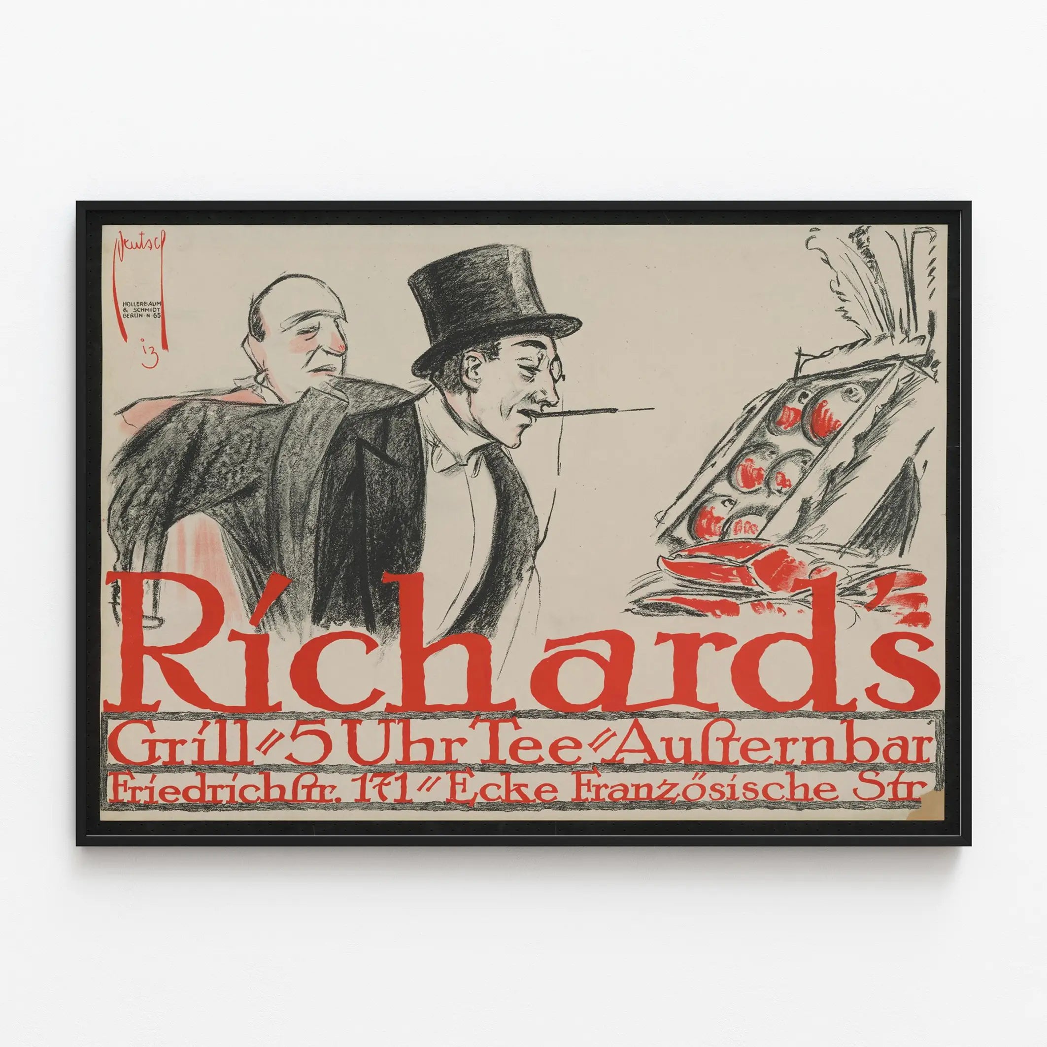 Ten plakat zręcznie korzysta z elementów typograficznych i ikonograficznych, z nazwą "Richards" zapisane dużymi czerwonymi literami, oraz szczegółami dotyczącymi adresu i godziny ("Grill 5 Uhr Tee Austernbar Friedrichstr. 171 Ecke Französische Str"), które nadają mu zarówno klimat starej reklamy, jak i wymiar historyczny całości. Scena najprawdopodobniej przedstawia przyjazne miejsce, grill lub bar z ostrygami, przywołując miejską i świąteczną atmosferę minionej epoki.
