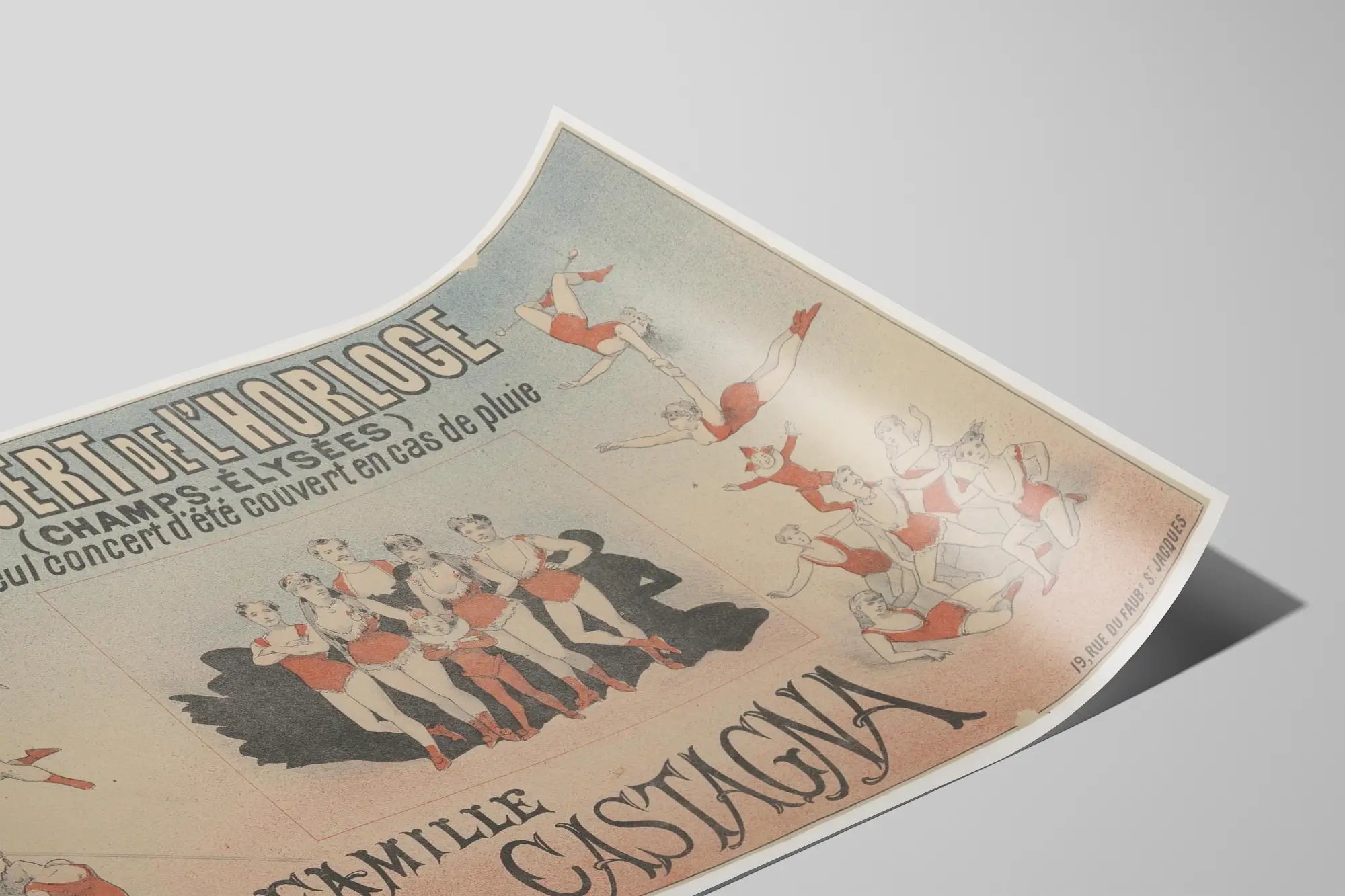 Odkryj tę vintage plakat dekoracyjny na ścianę zatytułowany „Rodzina Castagna”, unikalny egzemplarz, który przywołuje ducha dawnych pokazów cyrkowych. Wydrukowany w delikatnych odcieniach czerwieni, czerni i niebieskiego, ten plakat reklamowy przedstawia grupę artystów w kostiumach w czerwonych body, zgromadzonych na środku obrazu, otoczonych akrobatami w trakcie występu, którzy okrążają krawędzie. Całość nawiązuje do świata koncertów i widowisk plenerowych, a szczególnie do „Koncertu Zegara” na Polach Elizejskich, miejsca legendarnego i symbolicznego. Ten plakat jest doskonałym przykładem retro uroku, idealnym dla miłośników dekoracji ściennych, którzy chcą dodać wnętrzu odrobinę vintage i artystycznego charakteru. Jego typowy dla dawnych plakatów styl graficzny zachwyca estetyką i narracją, opowiadając historię rodziny i żywego spektaklu. Niezależnie od tego, czy to salon, pokój gier, czy przestrzeń kreatywna, ten plakat działa jak prawdziwe dzieło dekoracyjne, które uchwyca atmosferę świętowania i folkloru dawnych widowisk. Ten plakat łatwo wkomponować w dekoracje boho, retro lub vintage, dodając akcent koloru i wizualną zawartość pełną nostalgii. Jest skierowany zarówno do kolekcjonerów dzieł sztuki graficznej, jak i pasjonatów oryginalnej dekoracji ściennej. Dodanie tego plakatu do kolekcji to zaproszenie do wnętrza kawałka kulturowej i artystycznej historii, podkreślając znaczenie widowiska i rodziny w starannie i harmonijnie zaprojektowanym wnętrzu.