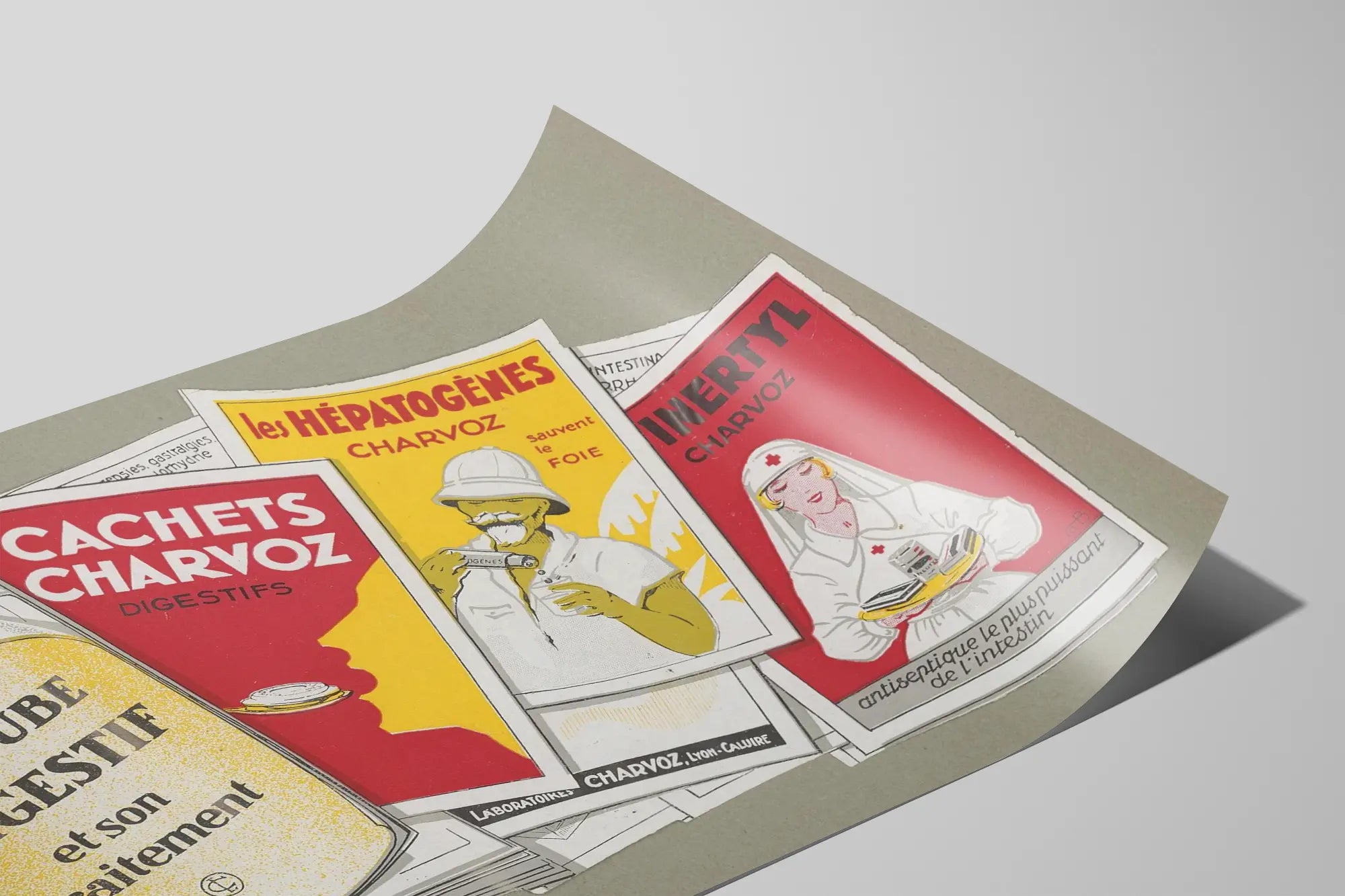 Odkryj tę plakat vintage przedstawiający zbiór starych dokumentów medycznych poświęconych układowi trawiennemu i jego leczeniu. Ta dekoracja ścienna ilustruje kilka reklam produktów farmaceutycznych marki Charvoz, specjalizujących się w leczeniu dolegliwości trawiennych i wątrobowych. Na tym plakacie zauważa się między innymi reklamy na „Kapsułki Charvoz trawienne”, „Hepatogeny Charvoz”, które są przedstawiane jako skuteczne dla wątroby, oraz na „Linertyl Charvoz”, opisywany jako silny środek antyseptyczny na jelita. Każdy dokument jest bogaty w żywe kolory, z jaskrawą czerwienią, jasnym żółtym i kontrastującą bielą, zapewniając dynamiczny i autentyczny efekt wizualny. Całość jest ułożona na neutralnym tle, podkreślając te stare wydruki, które nawiązują do czasów kampanii medycznych ilustrowanych na początku XX wieku. Ten plakat jest idealny jako oryginalna dekoracja ścienna w gabinecie lekarskim, aptece, a nawet dla miłośników przedmiotów i plakatów retro na temat zdrowia i ludzkiego ciała. Styl graficzny łączy ilustracje figuratywne z mocnymi typografiami, przypominając marketing z dawnych czasów skoncentrowany na opiece nad układem trawiennym. Podaruj swoim ścianom odrobinę historycznej medycyny dzięki temu vintage'owemu plakatowi, który również będzie ukłonem w stronę miłośników designu retro i sztuki reklamowej.