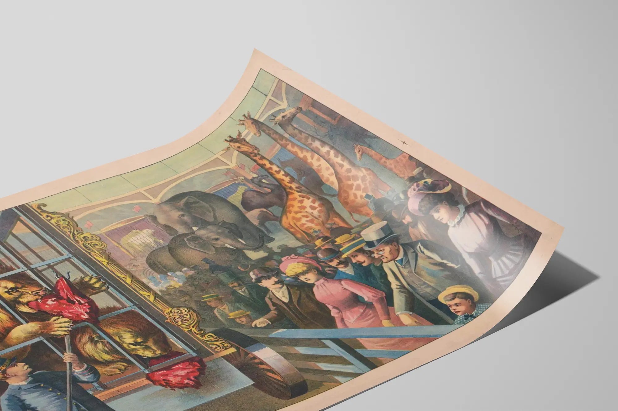 Odkryj tę plakat w stylu vintage przedstawiający typową scenę cyrkową, gdzie opiekun karmi lwy surowym mięsem przez pręty ich klatki. Ta kolorowa ilustracja podkreśla fascynację publiczności dzikimi zwierzętami w niewoli, z w tle słoni, żyraf i innych egzotycznych gatunków otoczonych szeroką grupą widzów ubranych w stylu retro. Ten plakat w stylu retro, bogaty w szczegóły i kolory, stanowi idealną dekorację ścienną dla miłośników sztuki starożytnej, cyrkowych pokazów lub dzikich zwierząt. Doda autentyczności i nostalgii Twojemu wnętrzu, niezależnie od tego, czy będzie to salon, biuro czy sala rodzinna. Plakat doskonale ukazuje zarówno relację człowiek-zwierzę w kontekście cyrku, jak i różnorodność fauny prezentowanej podczas tych historycznych pokazów. Ten obraz na ścianę wyróżnia się imponującą obecnością lwa chwytającego mięso, co stanowi silny kontrast z spokojem widzów całkowicie pochłoniętych sceną. To doskonały wybór na oryginalną i sugestywną dekorację ścienną, która zachwyci tych, którzy poszukują plakatu łączącego historię, naturę i życie cyrkowe.