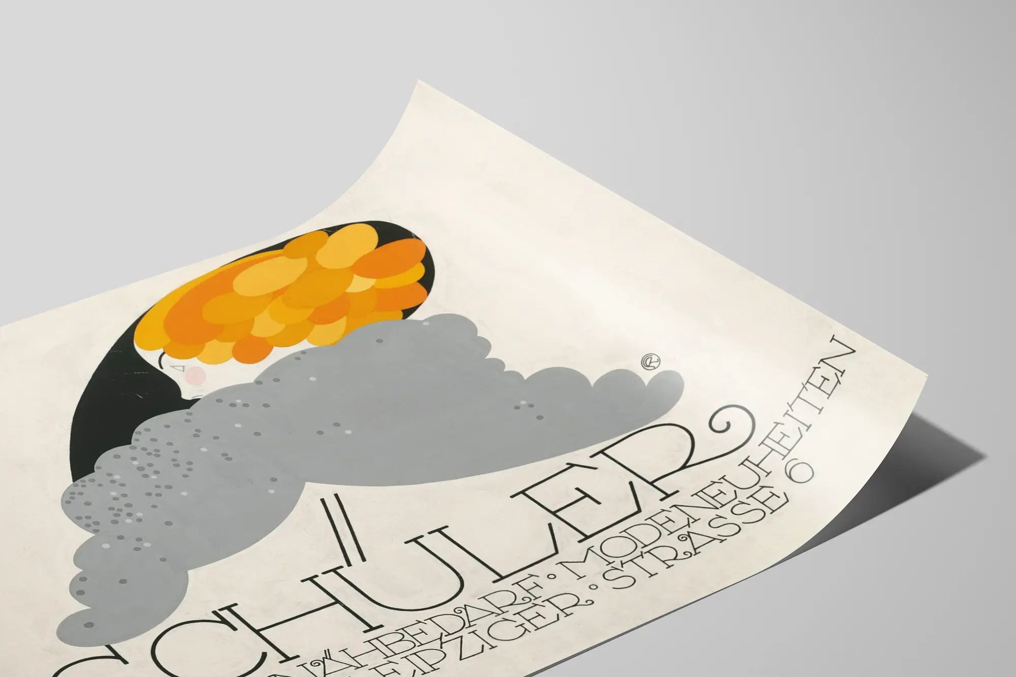 Ta vintage plakat SCHULER jest unikalnym elementem dekoracji ściennej, idealnym dla miłośników mody i sztuki graficznej z dawnych czasów. Przedstawia oryginalną i stylizowaną ilustrację kobiecej sylwetki o delikatnym profilu, ułożonej z ciepłymi odcieniami żółci i pomarańczy we włosach. Rysunek uzupełnia szary obłok z punktowanymi detalami, który dodaje subtelnego i eleganckiego kontrastu. Projekt graficzny, połączony z oryginalną i ozdobną typografią, przywołuje klimat retro związany ze światem krawiectwa i akcesoriów modowych, szczególnie z artykułami krawieckimi i nowościami marki SCHULER z siedzibą w Berlinie. Ta plakieta doskonale sprawdzi się jako element dekoracji ściennej, łączący styl dawny z wyrafinowanym akcentem artystycznym. Niezależnie od tego, czy będzie ozdobą salonu, sypialni czy pracowni twórczej, wnosi nutę autentyczności i wyrafinowania. Łatwo wpisze się w kolekcję vintage plakatów lub stanie się centralnym punktem wnętrza o tematyce artystycznej lub modowej. Ta dekoracja ścienna to także świetny wybór do sklepu lub przestrzeni poświęconej krawiectwu, gdzie z elegancją podkreśli świat tekstyliów i akcesoriów krawieckich. Ten minimalistyczny plakat o czystej formie przypadnie do gustu miłośnikom retro designu i oryginalnej dekoracji ściennej.