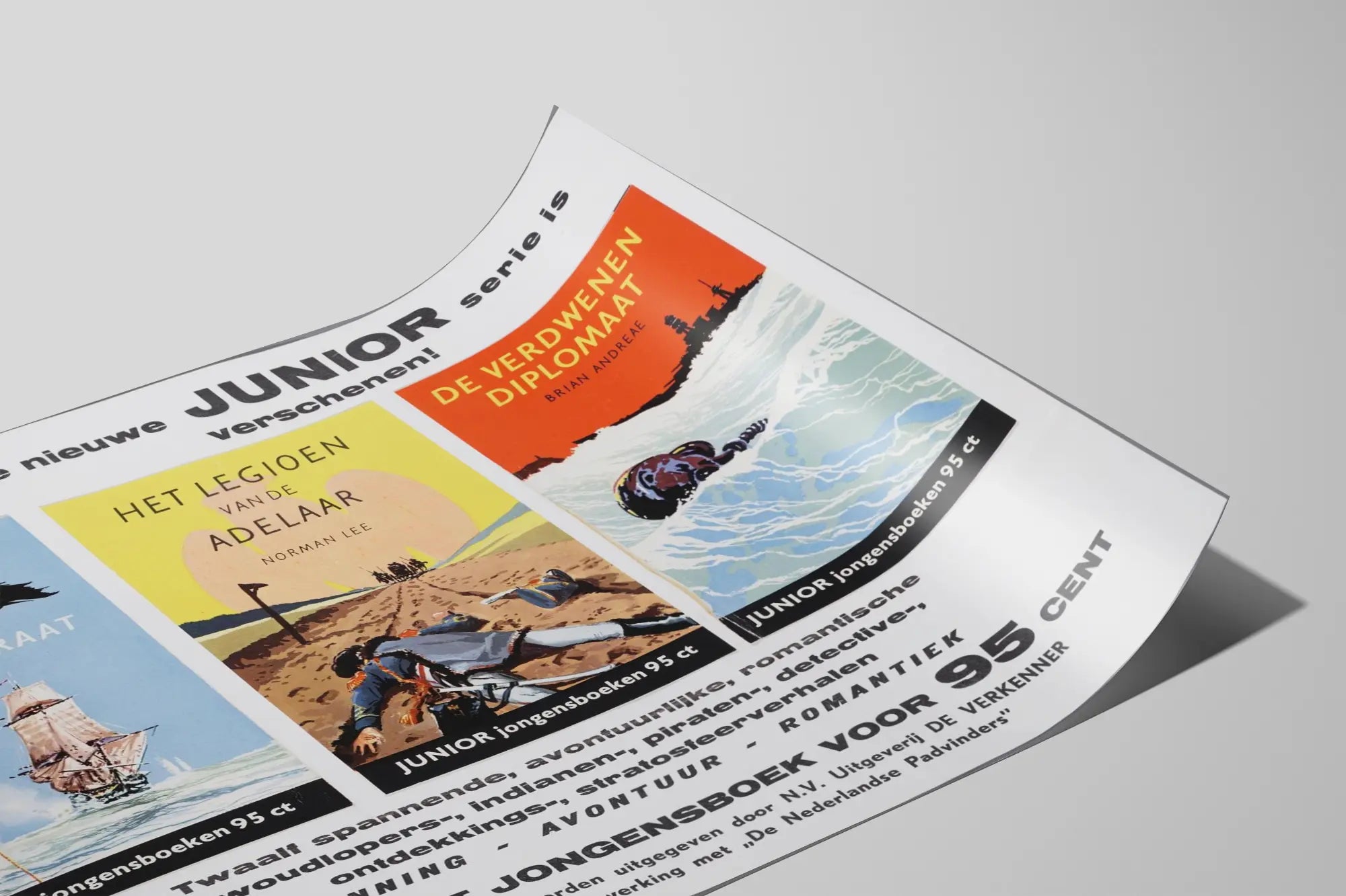 Ta vintage plakat przedstawia fascynującą serię skierowaną do młodych, zatytułowaną „Junior”, ukazującą trzy książki przygodowe. Każdy plakat odzwierciedla odrębny świat: „De spookpiraat” ukazuje piracki statek z czarną banderą ozdobioną czaszką na tle niebieskiego nieba, „Het legioen van de Adelaar” ilustruje dramatyczną scenę z poległymi żołnierzami na drodze pod dużym czerwonym słońcem, a „De verdwenen diplomaat” przedstawia wzburzone morze z sylwetką odległego budynku w tle. Te dzieła doskonale oddają temat dekoracji ściennych, charakteryzując się mocnymi i wyrazistymi grafikami, idealnymi do pokoju dziecięcego lub przestrzeni do czytania. Paleta barw jest zróżnicowana, od uspokajającego niebieskiego, przez jaskrawy żółty, po intensywny pomarańcz, wnosząc dynamizm i energię do tych plakatów. Ta seria została stworzona, aby pobudzać wyobraźnię młodych miłośników przygód i tajemnic, łącząc elementy piractwa, legionów bojowych i dyplomatycznego szpiegostwa. Wywołuje również romantyczną i odważną atmosferę, doskonałą do wzbogacenia dekoracji ściennej nutą nostalgii i eksploracji. Te plakaty to doskonały wybór dla miłośników dekoracji ściennych, którzy chcą wprowadzić do wnętrza klimat vintage i narracyjny.