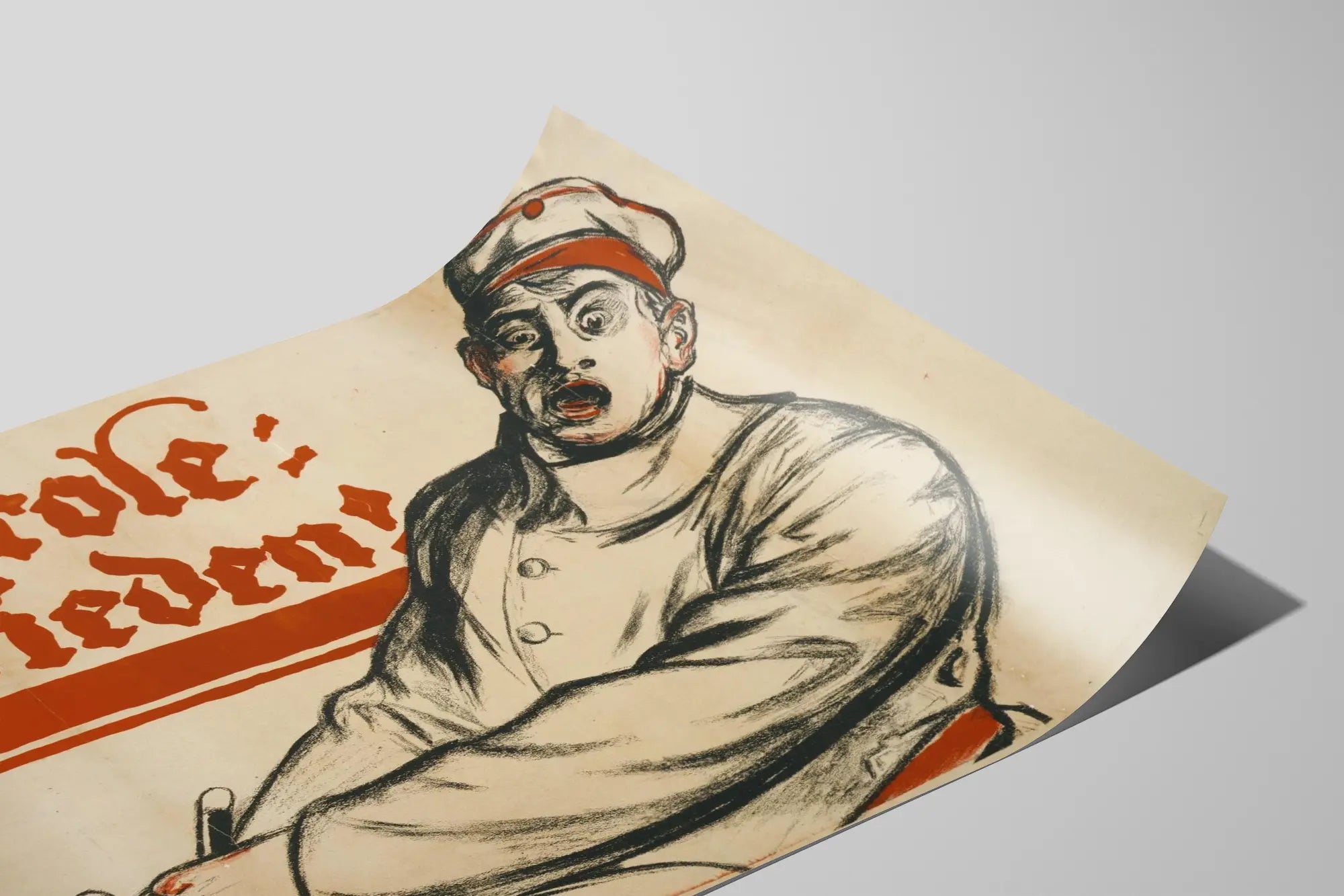 Poznaj ten vintage plakat o wyrazistym stylu ekspresjonistycznym, przedstawiający postać z wyrazistą twarzą ubraną w jasny mundur i nakrycie głowy. Ten plakat wywołuje silne emocje, z napisem "Parole: Frieden!" zapisanym czerwonymi gotyckimi literami, podkreślającym przesłanie pokoju lub pilny apel. Kompozycja opiera się na wyraźnym kontraście między czernią a ochrowymi odcieniami, co podkreśla cechy postaci, której postawa zaskakuje i intryguje widza. Ta dekoracja ścienna, dzięki swojemu graficznemu stylowi i pełnej napięcia atmosferze, wyróżnia się jako oryginalny i pełen znaczenia element dekoracyjny, idealny do stylu retro lub wyrazistej ekspresji. Doskonała dla miłośników plakatów o dramatycznym wyrazie, świetnie sprawdzi się zarówno w salonie, bibliotece, jak i w miejscu pracy, gdzie pożądana jest moc przekazu wizualnego. Ten vintage plakat wnosi odrobinę historii i unikalnej estetyki, łącząc ekspresyjną ilustrację z wyrazistą typografią, świadcząc o zaangażowanej przeszłości artystycznej. Ścienna dekoracja, którą warto wyróżnić ze względu na jej efekt wizualny i autentyczny styl.