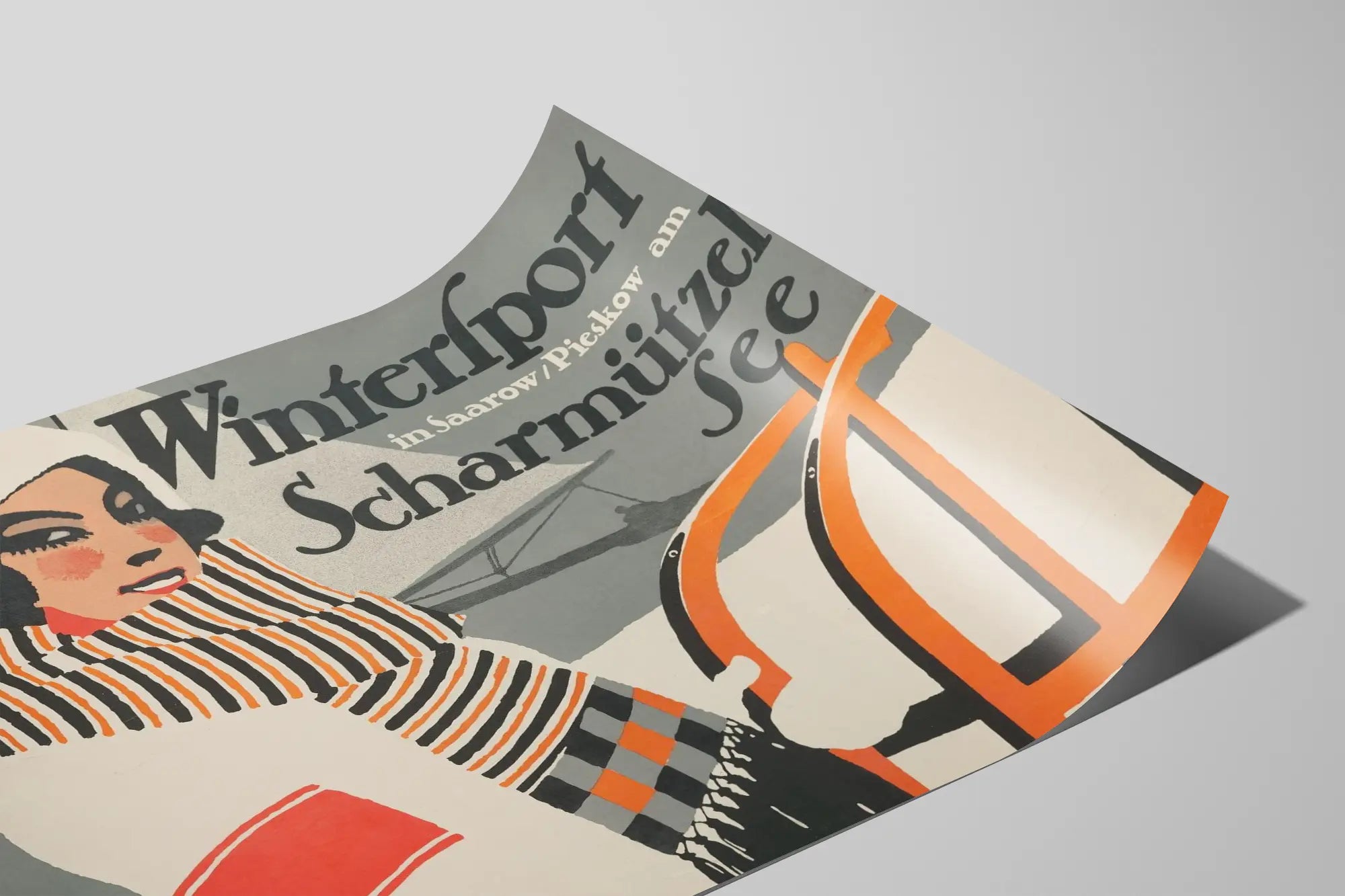Ta vintage plakat sportów zimowych w stylu i elegancji oddaje atmosferę zimowego regionu Saarow/Pieskow nad jeziorem Scharmützel. Ukazuje kobietę ubraną w biały płaszcz i dużą, pasiastą chustę, charakterystyczne akcesoria zimowego wyglądu, z białą czapką dopełniającą jej ciepły wygląd. Dominujące, stonowane i ciepłe kolory przeplatają odcienie szarości, czerni, bieli oraz akcenty pomarańczowe, tworząc silny i dynamiczny kontrast wizualny. W tle widoczne są szkicowe sylwetki innych osób zaangażowanych w zimowe aktywności, w tym jazdę na łyżwach, co dodaje scenie żywego i radosnego charakteru. Dostrzegalna jest także łódka na jeziorze, podkreślająca naturalny krajobraz i różnorodność dostępnych rozrywek. Tekst w języku niemieckim przypomina o duchu sportu i atrakcji turystycznej, kładąc nacisk na urok jeziora Scharmützel dla miłośników sportów zimowych. Ten stary plakat to doskonały element dekoracji ściennej, idealny dla tych, którzy chcą wprowadzić do wnętrza retro urok i zimową atmosferę. Jego graficzny styl, nawiązujący do estetyki lat 20-30, czyni go także poszukiwanym przedmiotem kolekcjonerskim. Niezależnie od tego, czy chodzi o przytulny klimat w salonie, pokój rekreacyjny czy przestrzeń tematyczną związaną z podróżami i zimą, ten vintage plakat wzbogaci Twoją dekorację ścienną autentycznością i charakterem. Bardzo wyrazisty, obraz przyciąga wzrok ku uśmiechniętej twarzy kobiety, symbolizującej entuzjazm i radość z zimowych sportów. Ta plakat to zaproszenie do relaksu i przygody na świeżym powietrzu w naturalnym i stylizowanym otoczeniu, doskonale łącząc sztukę i historyczną reklamę.