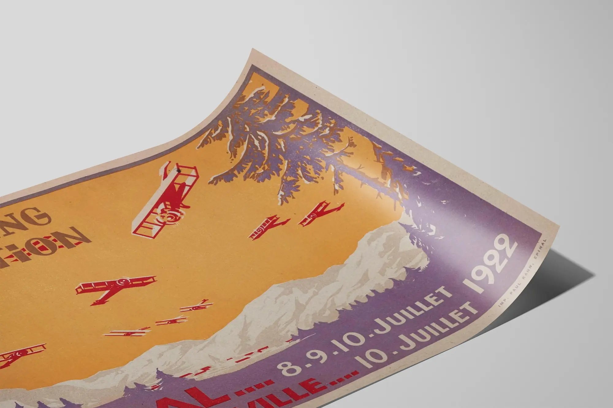 Ta vintage plakat z serii Meeting d'Aviation to unikalny element dekoracji ściennej, który zachwyci miłośników lotnictwa i retro grafiki artystycznej. Przedstawia wydarzenie lotnicze, które miało miejsce w Épinal i Contrexéville w lipcu 1922 roku, obejmujące daty od 8 do 10 w Épinal oraz 10 w Contrexéville. Ten plakat ukazuje kilka dwupłatowców i sterowiec unoszących się na pomarańczowym niebie nad górzystym krajobrazem, otoczonym drzewami po bokach. Styl graficzny jest typowy dla lat dwudziestych, z dominującymi ciepłymi barwami, takimi jak ochra, czerwień i fiolet, tworząc atmosferę zarówno nostalgiczna, jak i dynamiczną. Ten stary plakat został wydrukowany przez Paula Kahna z Épinal, co potwierdza jego autentyczność i lokalne pochodzenie. Jako element dekoracji ściennej, wniesie do wnętrza nutę vintage i historycznego charakteru, niezależnie od tego, czy będzie zdobił salon, biuro czy pokój kolekcjonerski. Ten dekoracyjny plakat o tematyce lotniczej jest idealny do stworzenia retro atmosfery inspirowanej pierwszymi wielkimi zlotami lotniczymi, symbolizującymi entuzjazm dla początków lotnictwa cywilnego i sportowego. Jego zrównoważona kompozycja tekstu i ilustracji podkreśla wydarzenie, jednocześnie oferując bogaty wizualnie element do ozdobienia ściany z charakterem. Niezależnie od tego, czy jesteś pasjonatem lotnictwa, kolekcjonerem starych plakatów, czy po prostu szukasz oryginalnego elementu dekoracyjnego, ten ścienny plakat Meeting d'Aviation stanowi estetyczny i sugestywny wybór. Doskonale wpisze się zarówno w nowoczesne wnętrza z akcentami historycznymi, jak i w klasyczną dekorację z elementami vintage. Ten plakat to zaproszenie do podróży w czasie przez ekspresywną grafikę, w której lotnictwo jest źródłem fascynacji i innowacji. Jego obecność na ścianach przywoła energię i widowiskowość lotów pokazowych z lat dwudziestych, jednocześnie podnosząc estetykę i styl Twojego wnętrza.